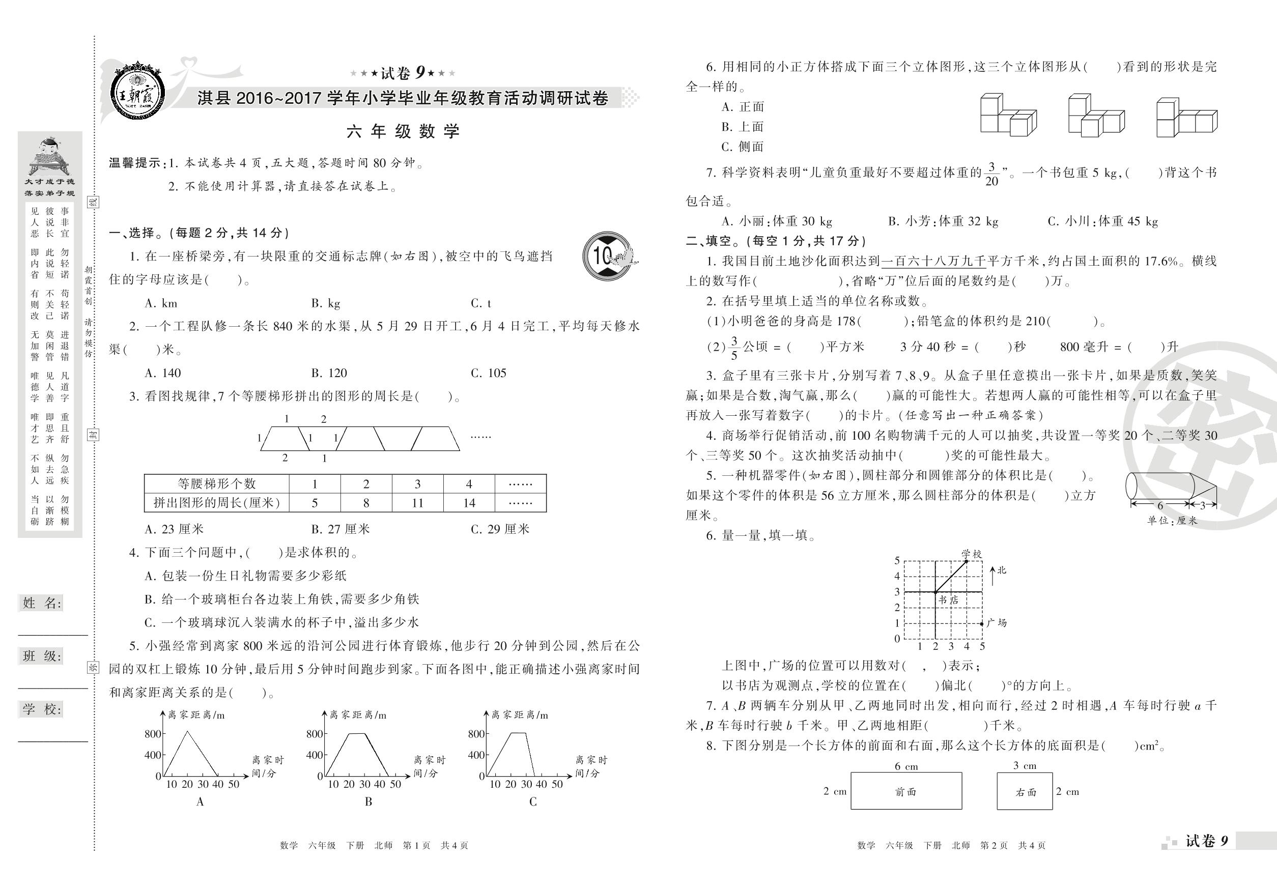 2016-2017学年第二学期鹤壁市淇县六年级数学试卷(北师版)【9】