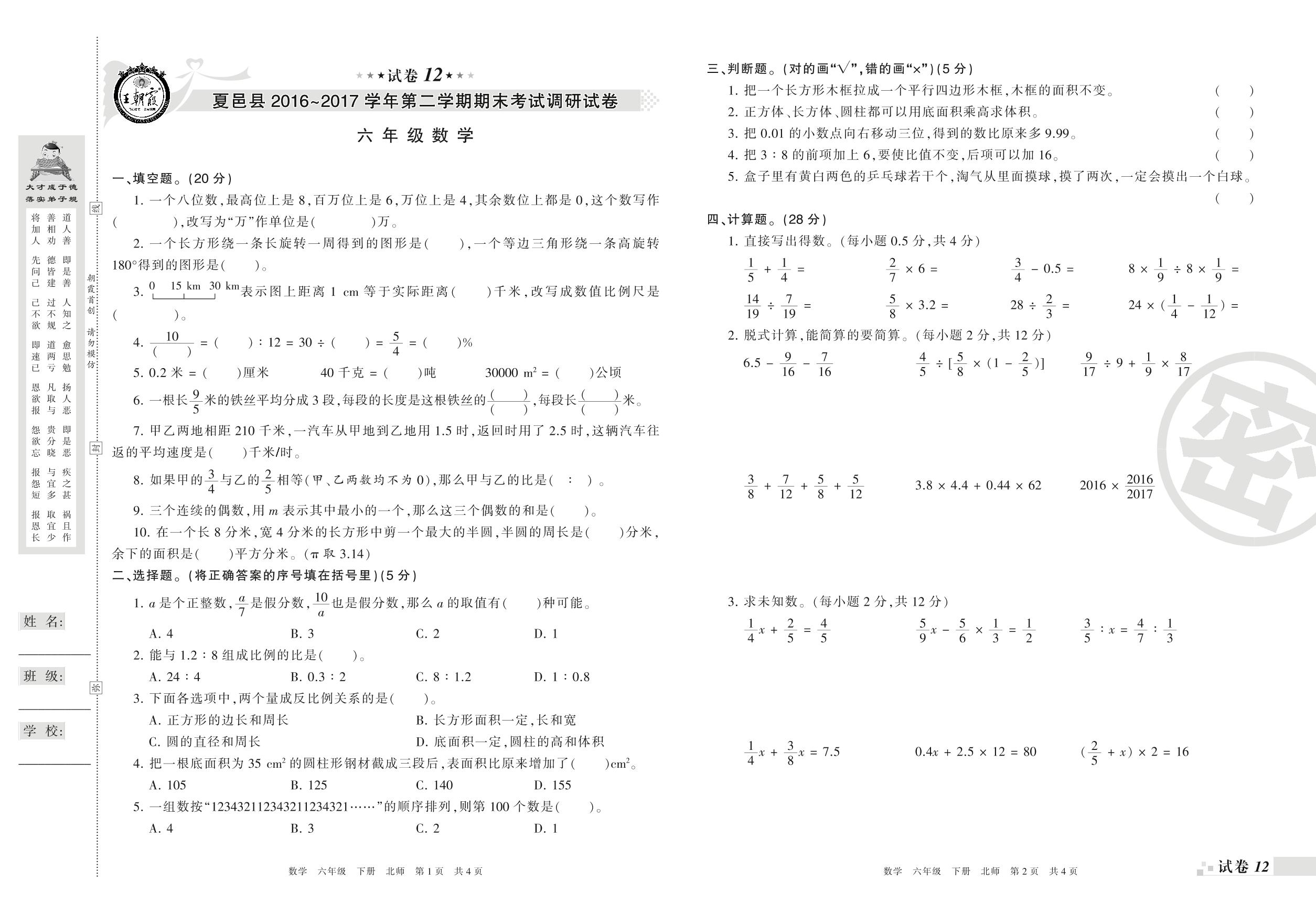 2016-2017学年第二学期商丘市夏邑县六年级数学试卷(北师版)【12】
