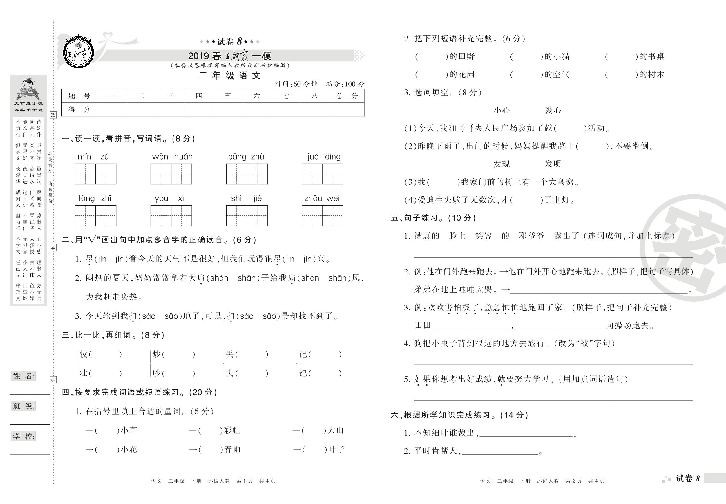 王朝霞期末模拟卷二年级下册语文(人教版)_R21080173217【8】