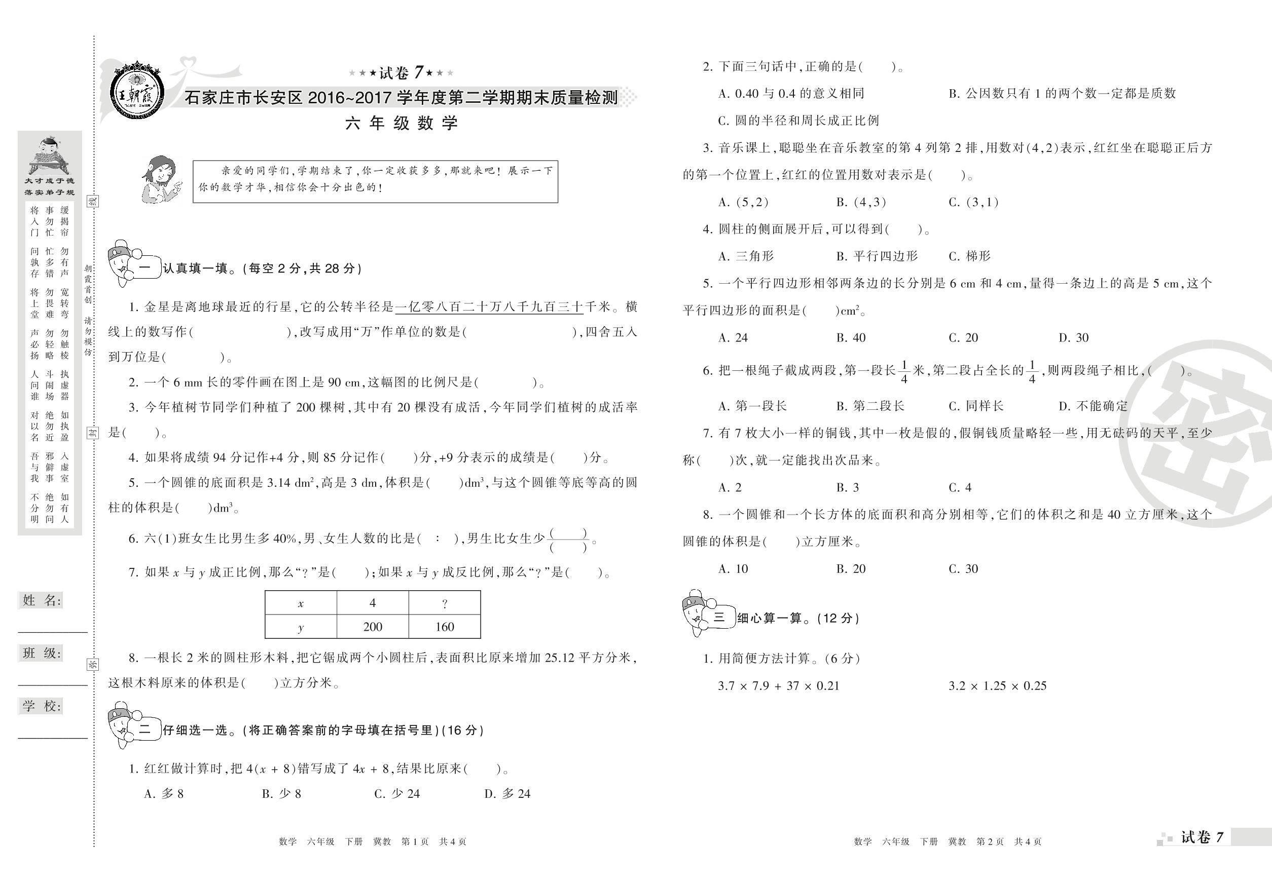 2016-2017学年第二学期石家庄市长安区六年级数学试卷(冀教版)【7】