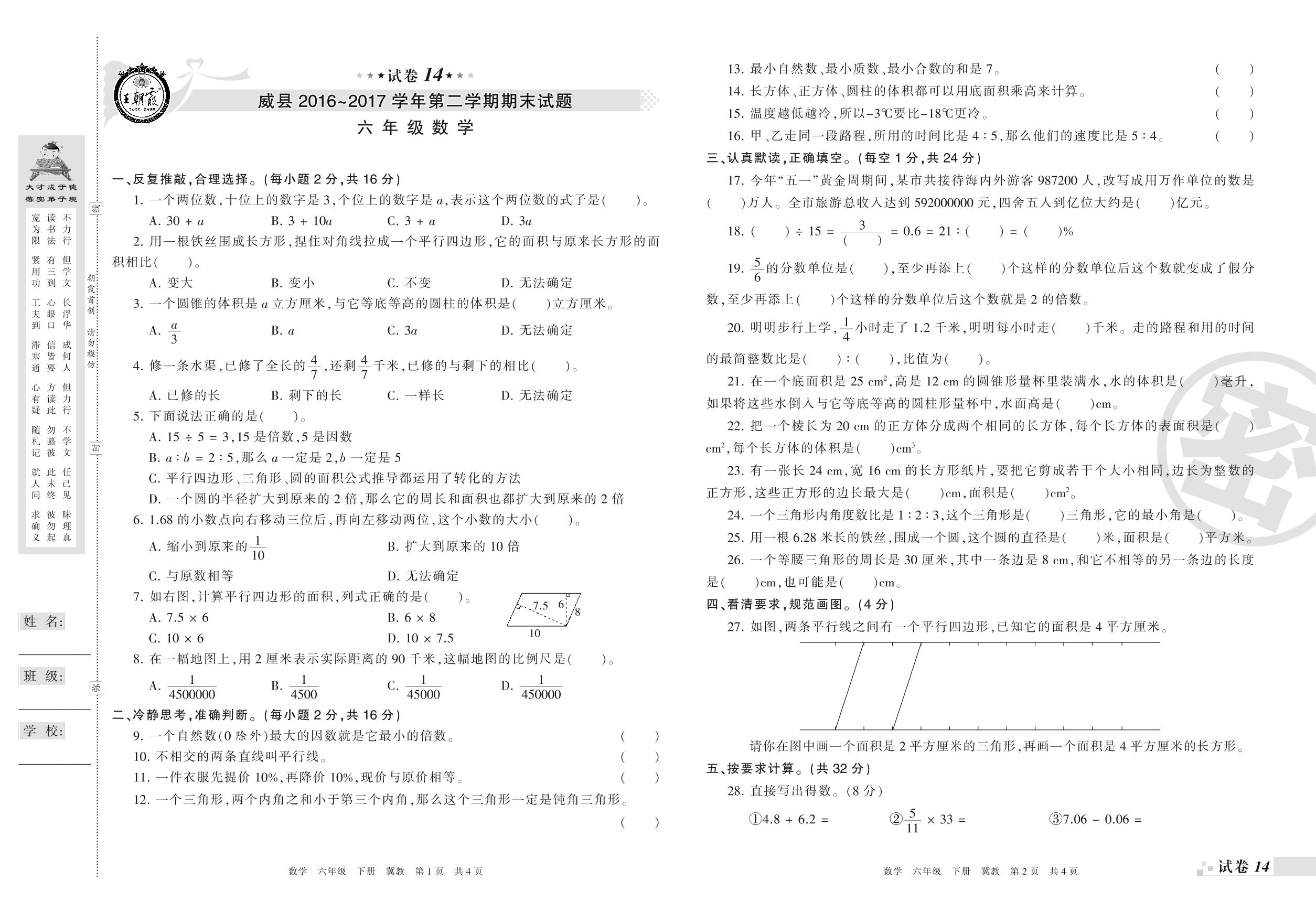 2016-2017学年第二学期邢台市威县六年级数学试卷(冀教版)【14】