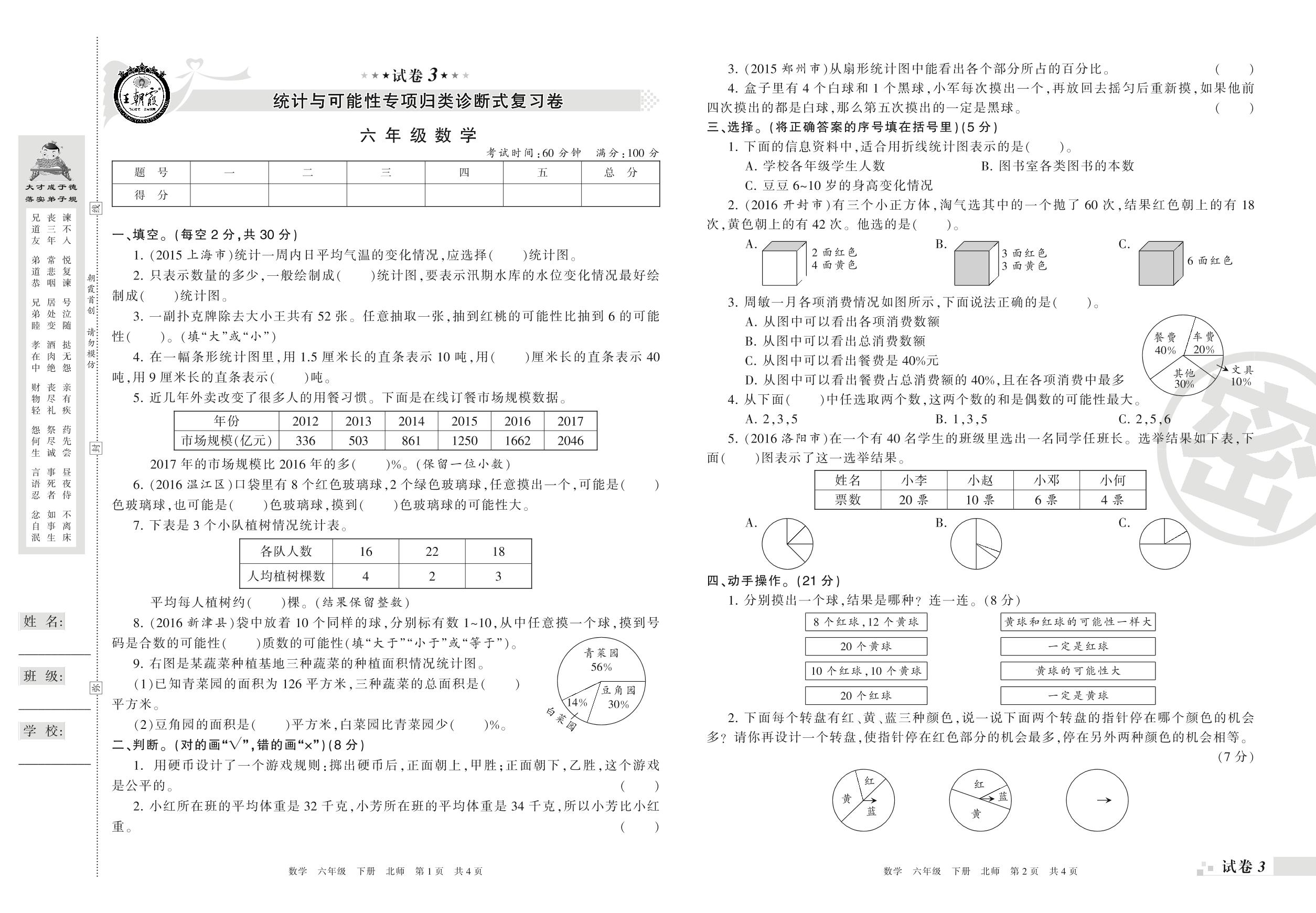 王朝霞期末专项卷——统计与可能性专项归类诊断式复习卷六年级下册数学(北师版)【3】