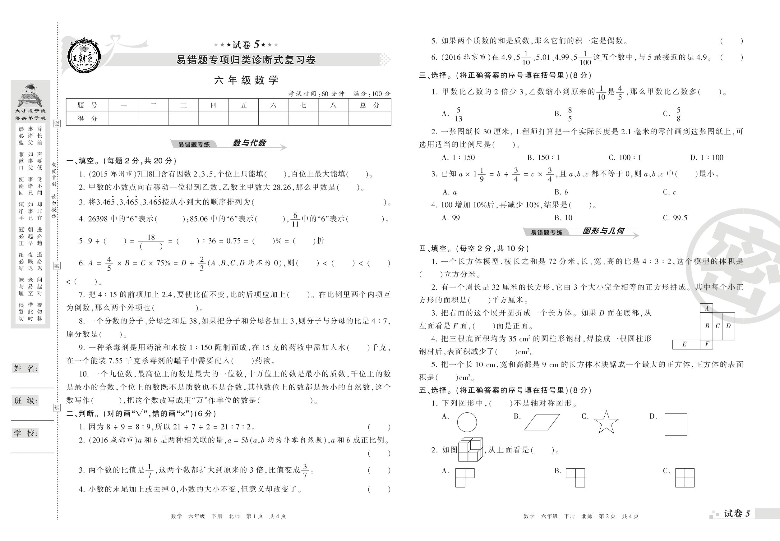 王朝霞期末专项卷——易错题专项归类诊断式复习卷六年级下册数学(北师版)【5】