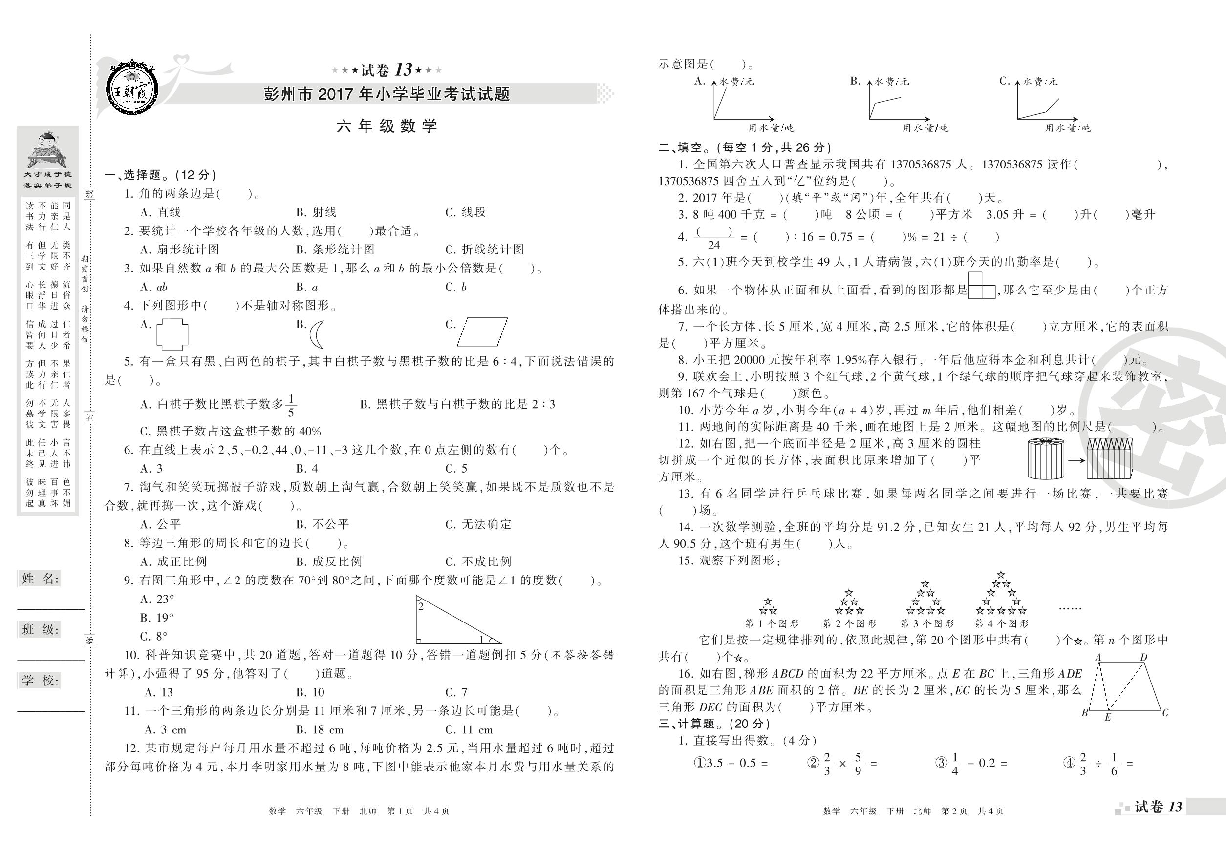2016-2017学年第二学期彭州市六年级数学试卷(北师版)【13】
