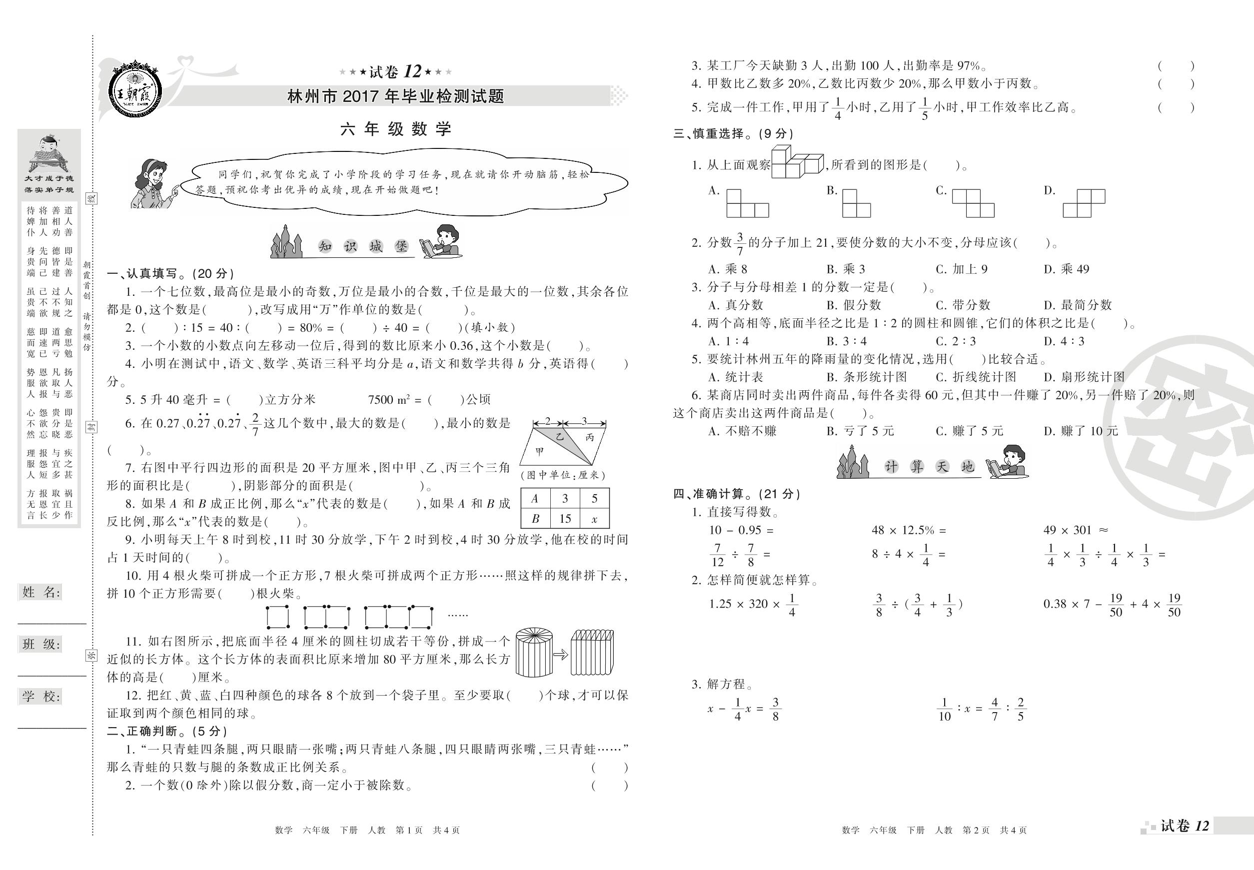 2016-2017学年第二学期林州市六年级数学试卷(人教版)【12】