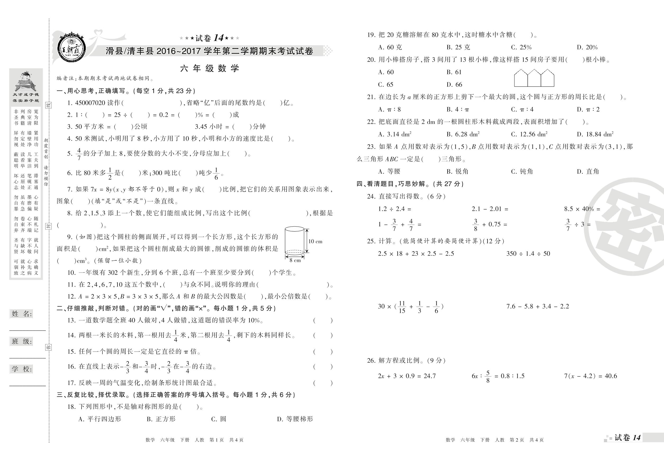 2016-2017学年第二学期安阳市滑县 清丰县六年级数学试卷(人教版)【14】