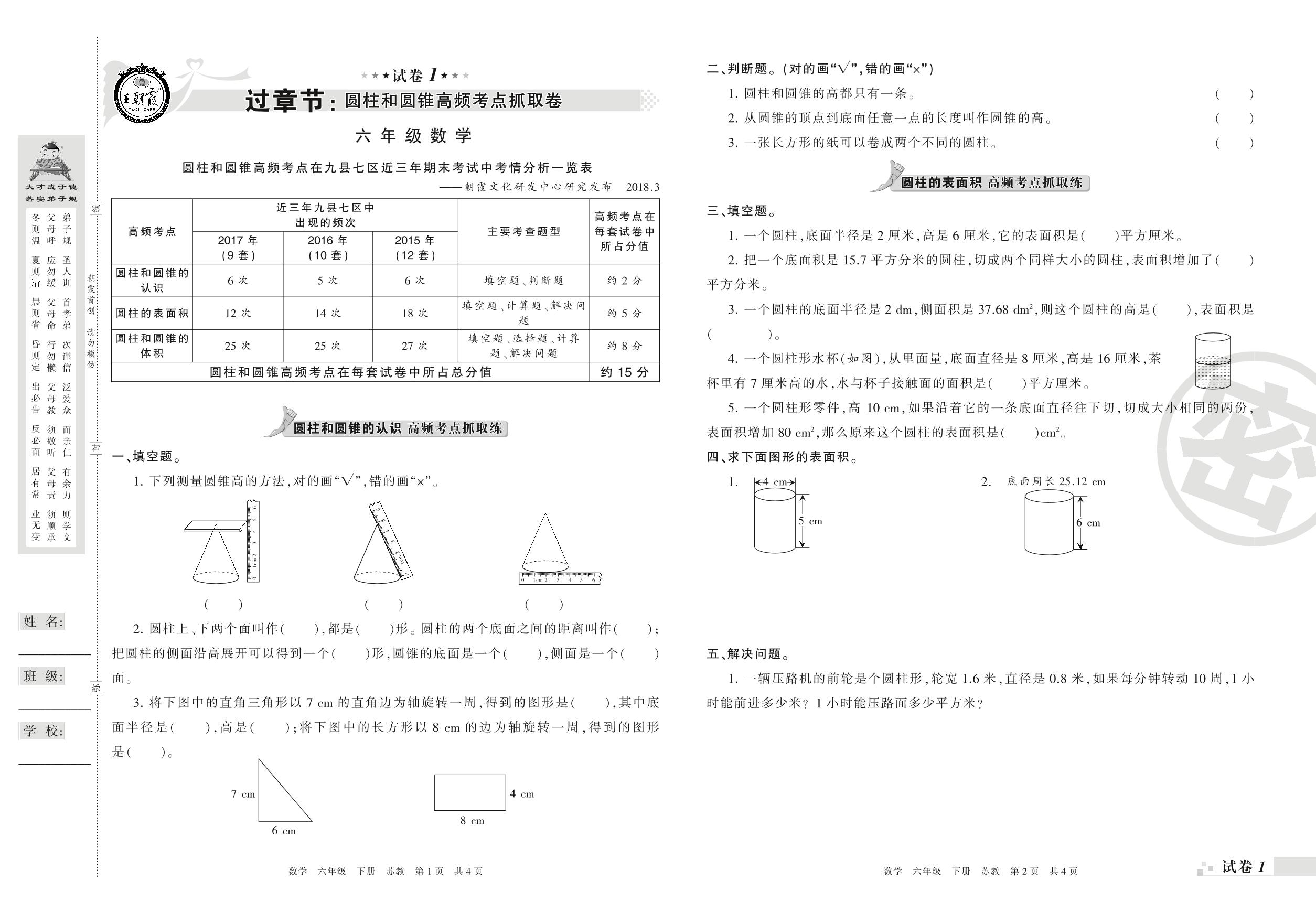 王朝霞期末过章节:圆柱和圆锥高频考点抓取卷六年级下册数学(苏教版)【1】