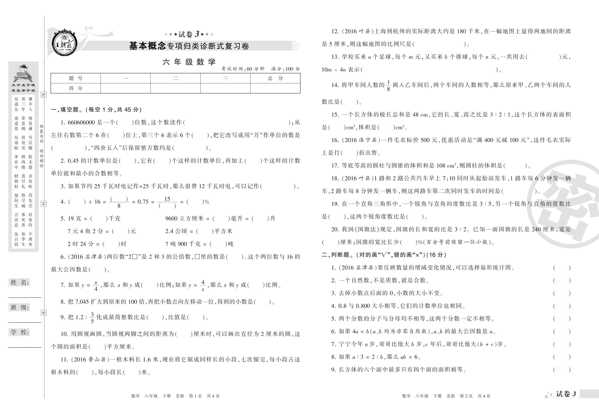 王朝霞期末专项卷——基本概念专项归类诊断式复习卷六年级下册数学(苏教版)【3】