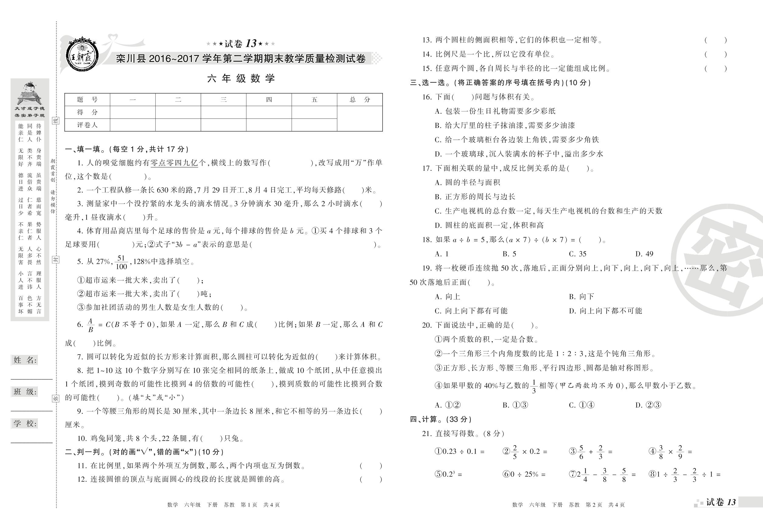 2016-2017学年第二学期洛阳市栾川县六年级数学试卷(苏教版)【13】