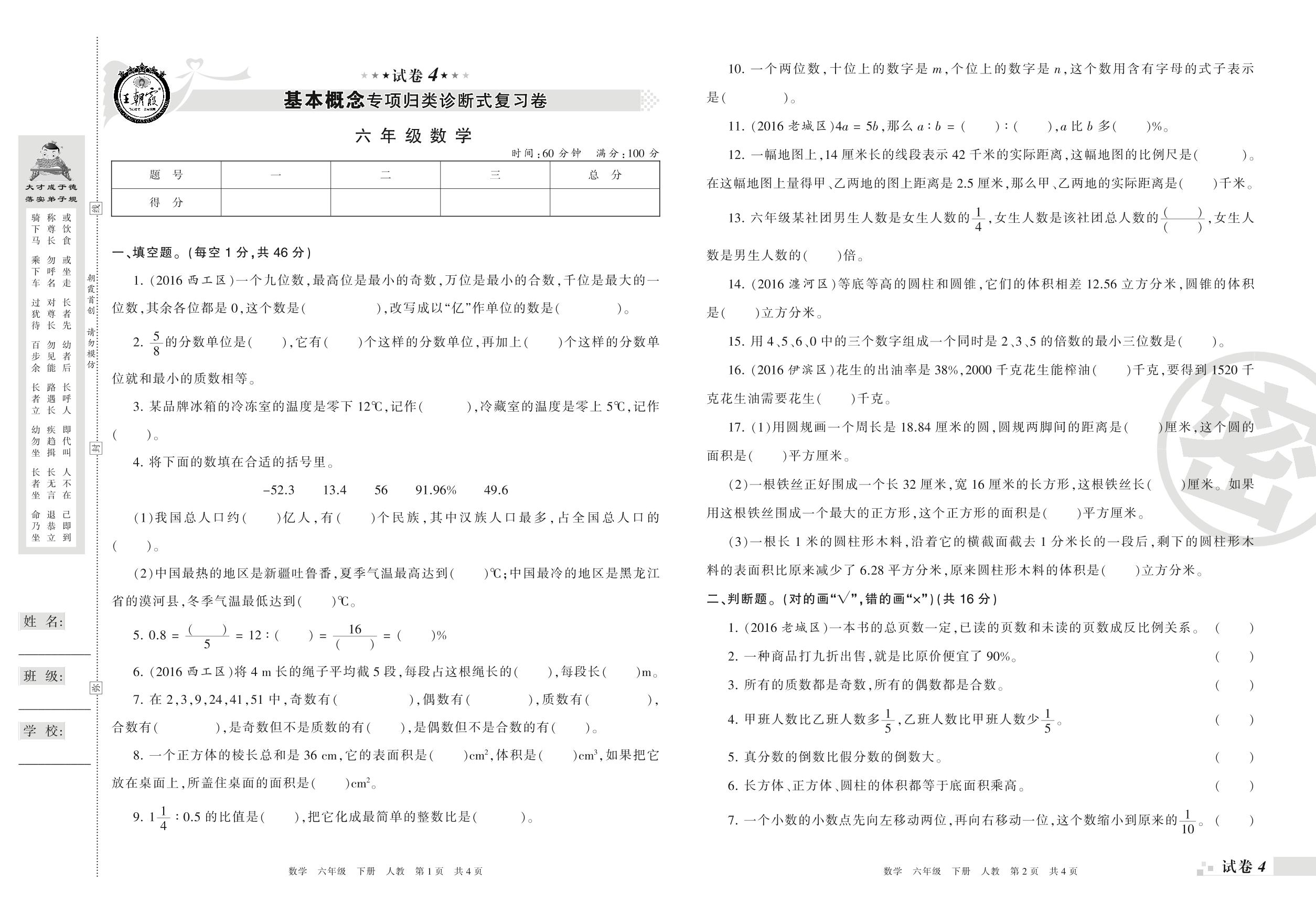 王朝霞期末专项卷——基本概念专项归类诊断式复习卷六年级下册数学(人教版)_R210805133742【4】
