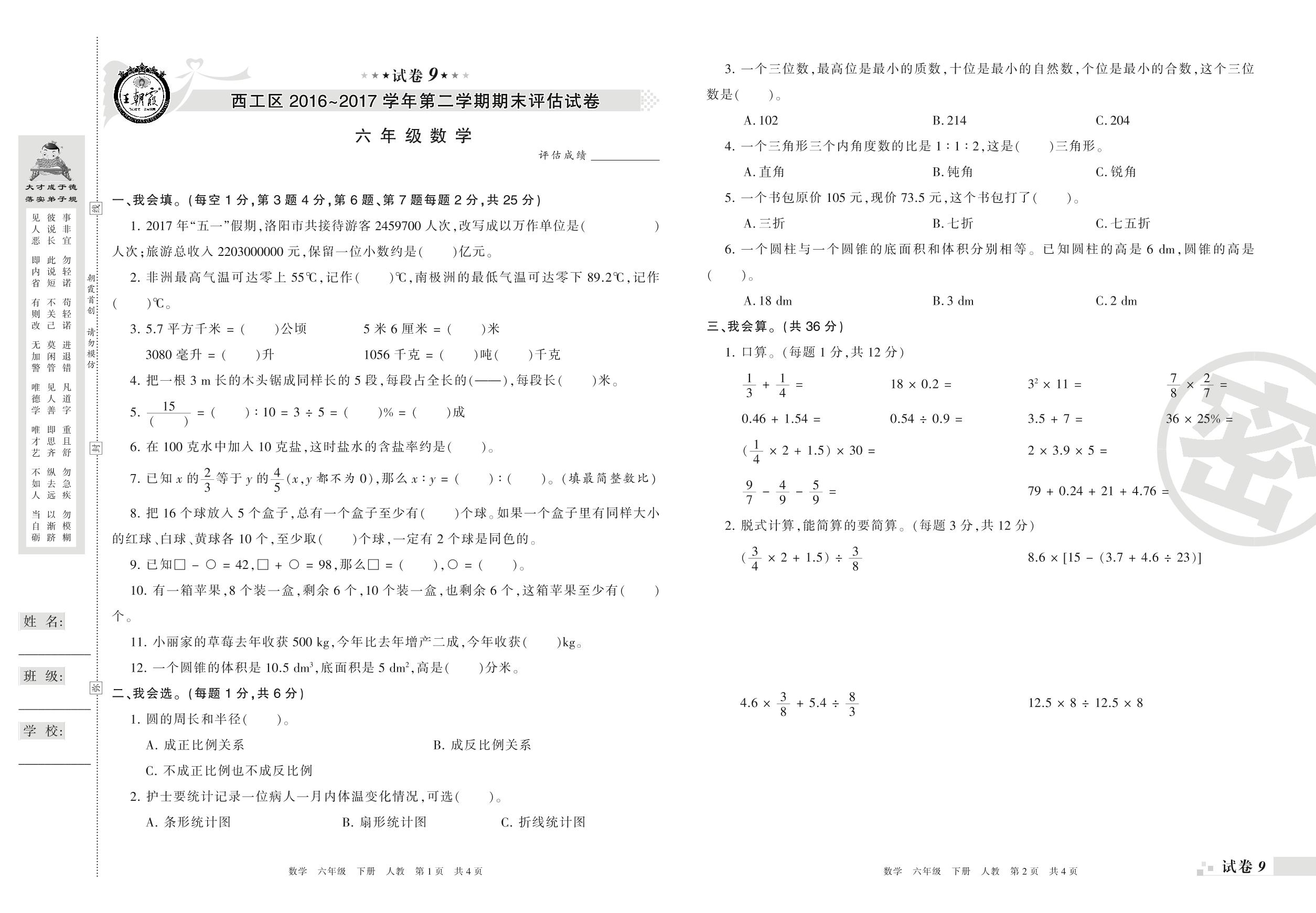 2016-2017学年第二学期洛阳市西工区六年级数学试卷(人教版)【9】
