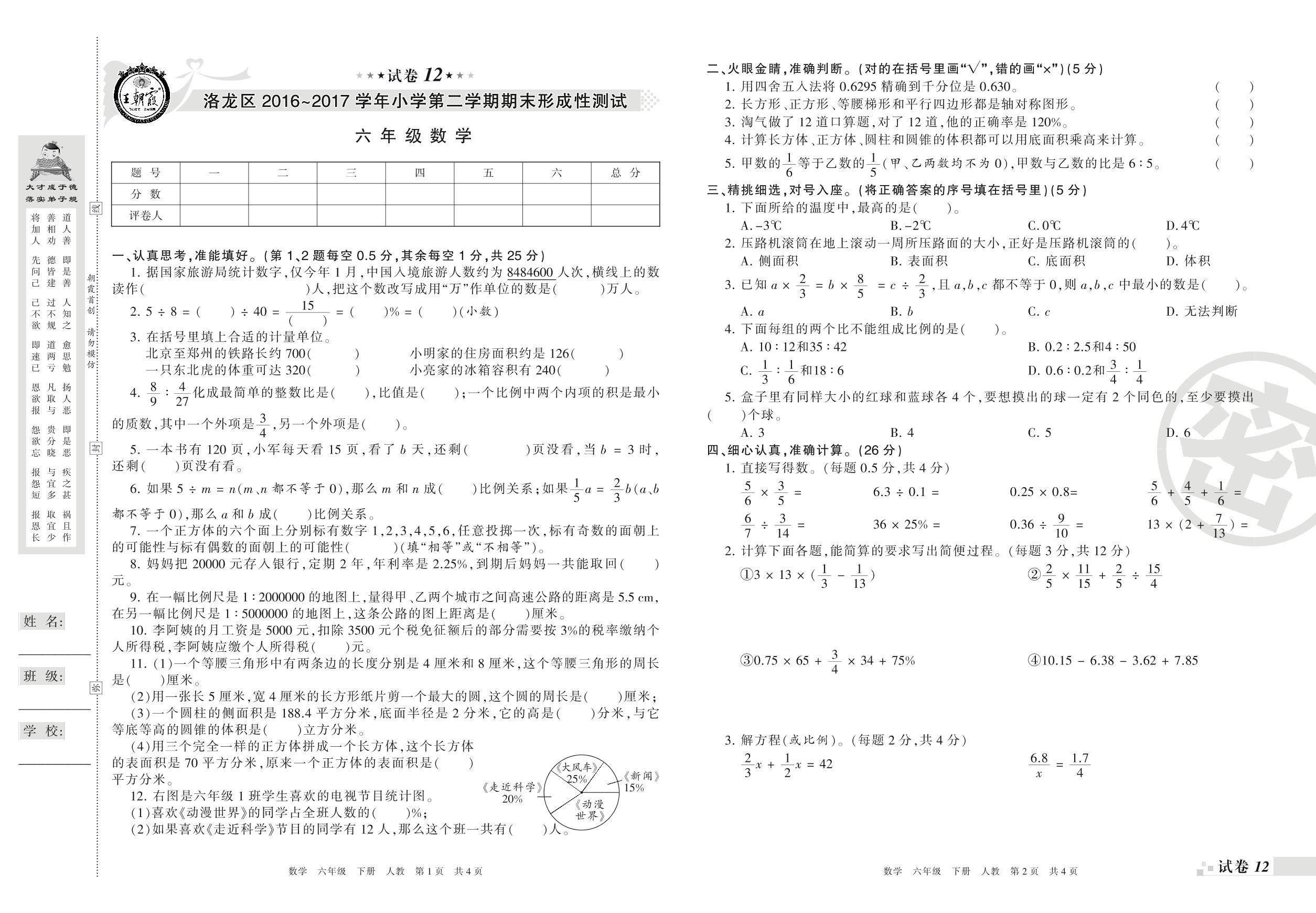 2016-2017学年第二学期洛阳市洛龙区六年级数学试卷(人教版)【12】