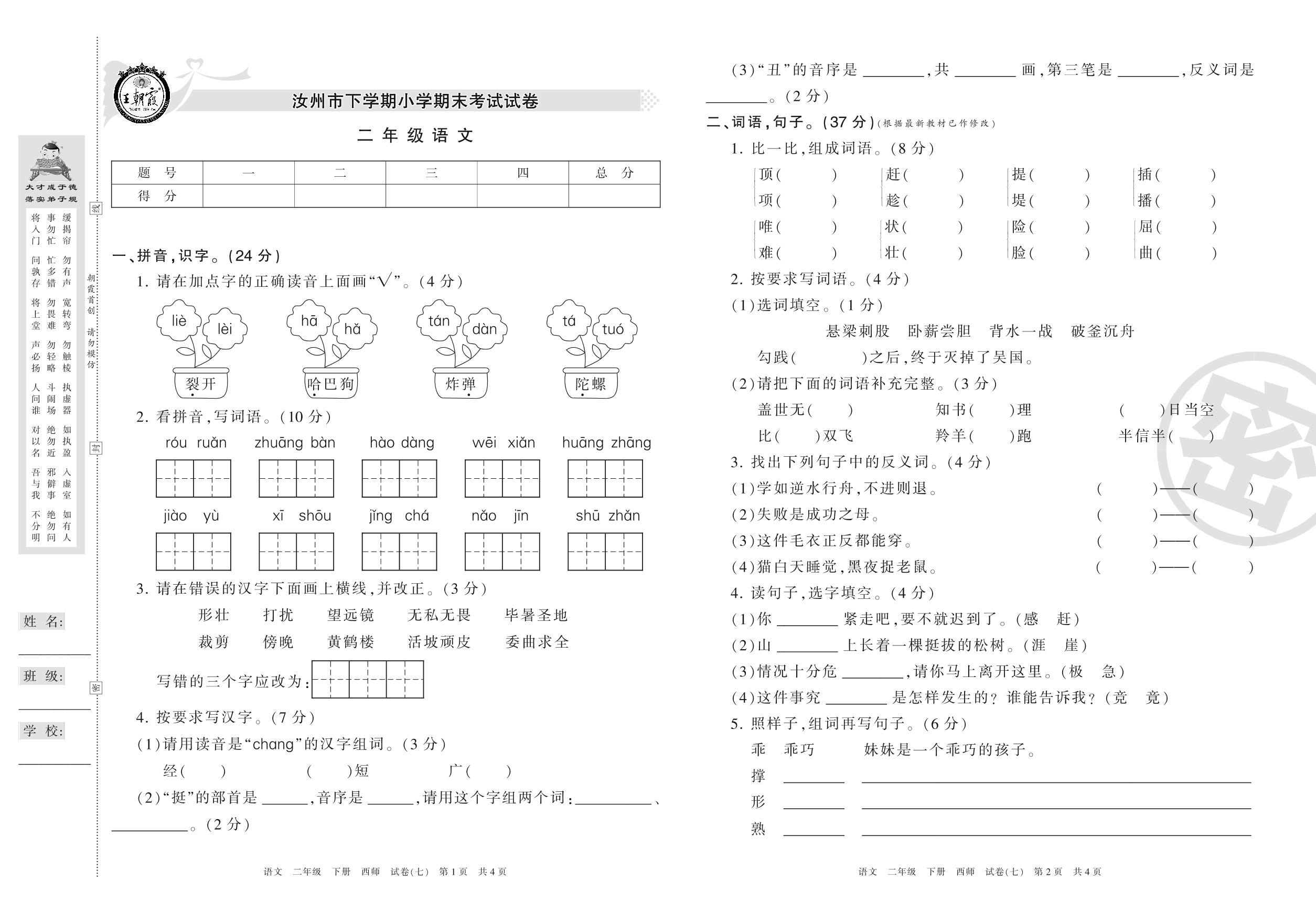 2015-2016学年第二学期汝州市二年级语文试卷(西师版)【7】