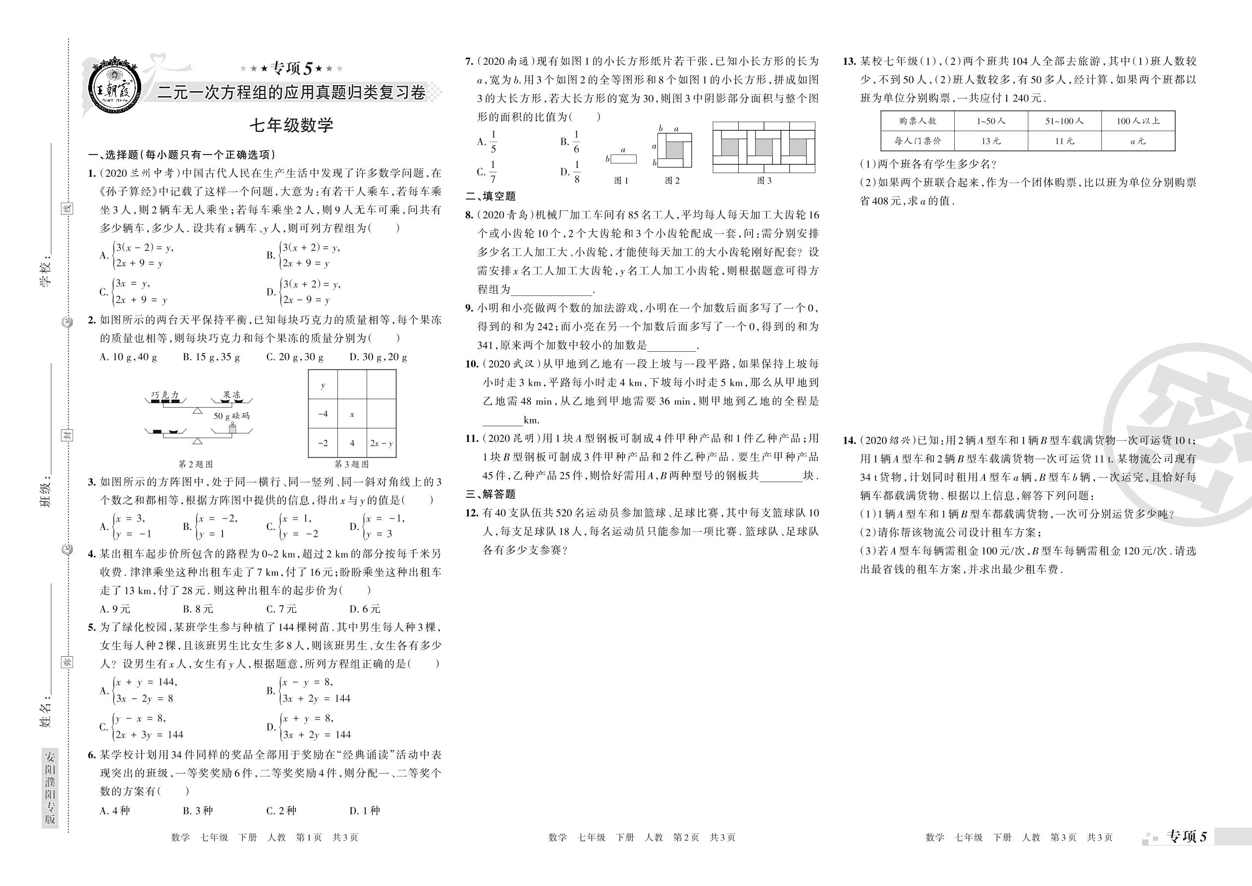 王朝霞期末专项卷——二元一次方程组的应用、不等式与不等式方程组的认识与解法真题归类复习七年级下册数学(人教版)【0】