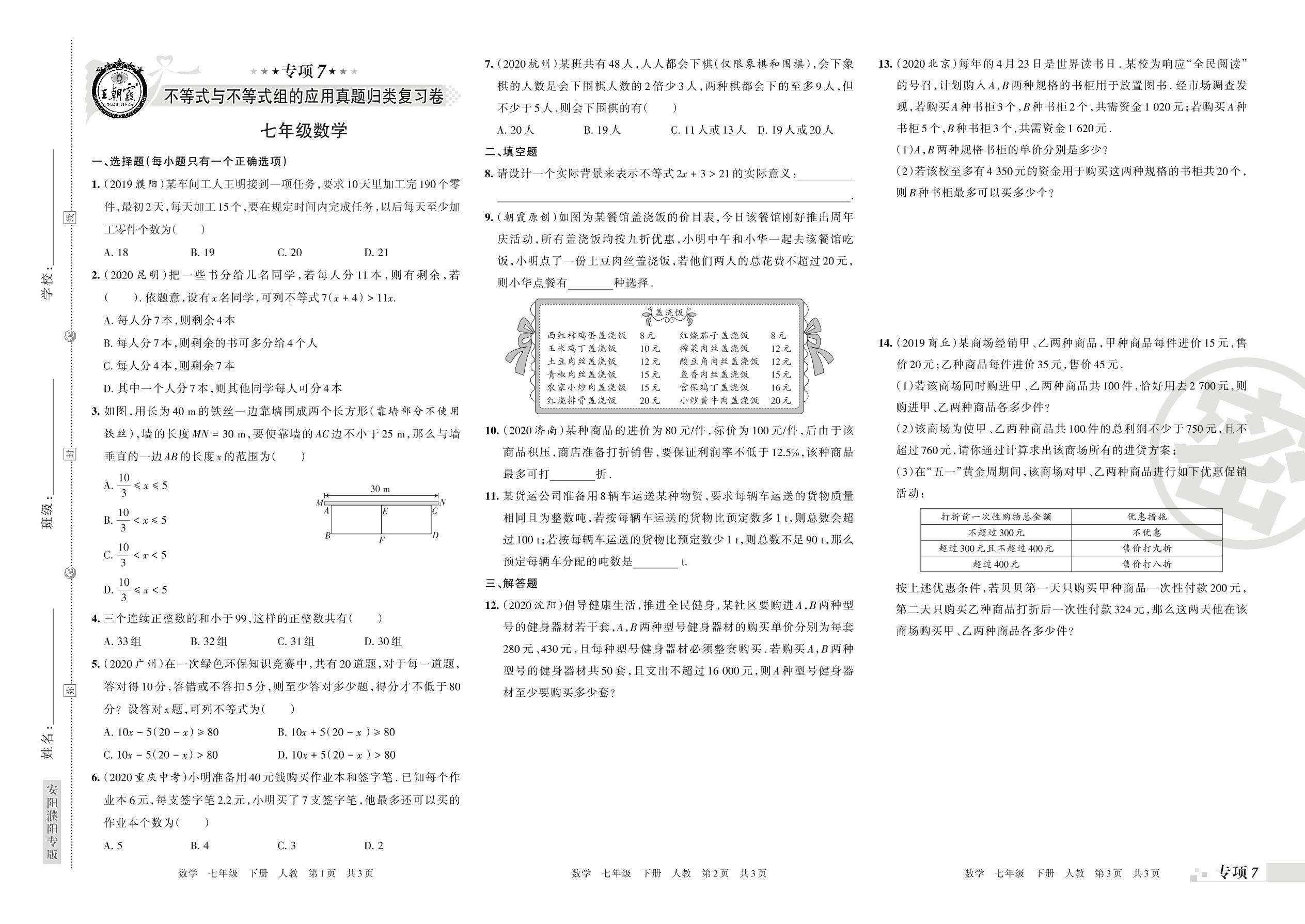 王朝霞期末专项卷——不等式与不等式组的应用、数据的收集、整理与描述真题归类复习七年级下册数学(人教版)【0】