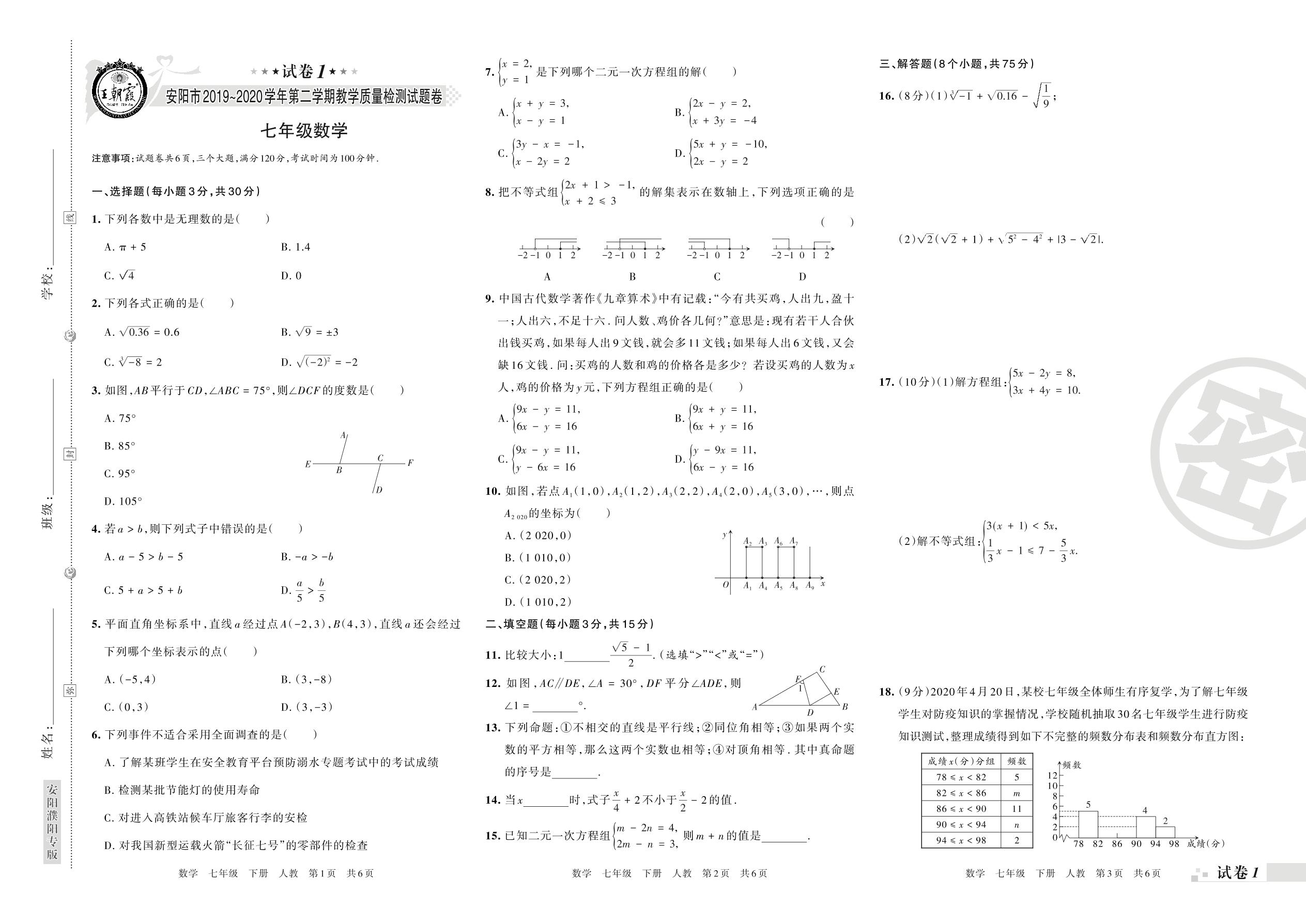 2019-2020学年第二学期安阳市七年级数学试卷(人教版)【1】