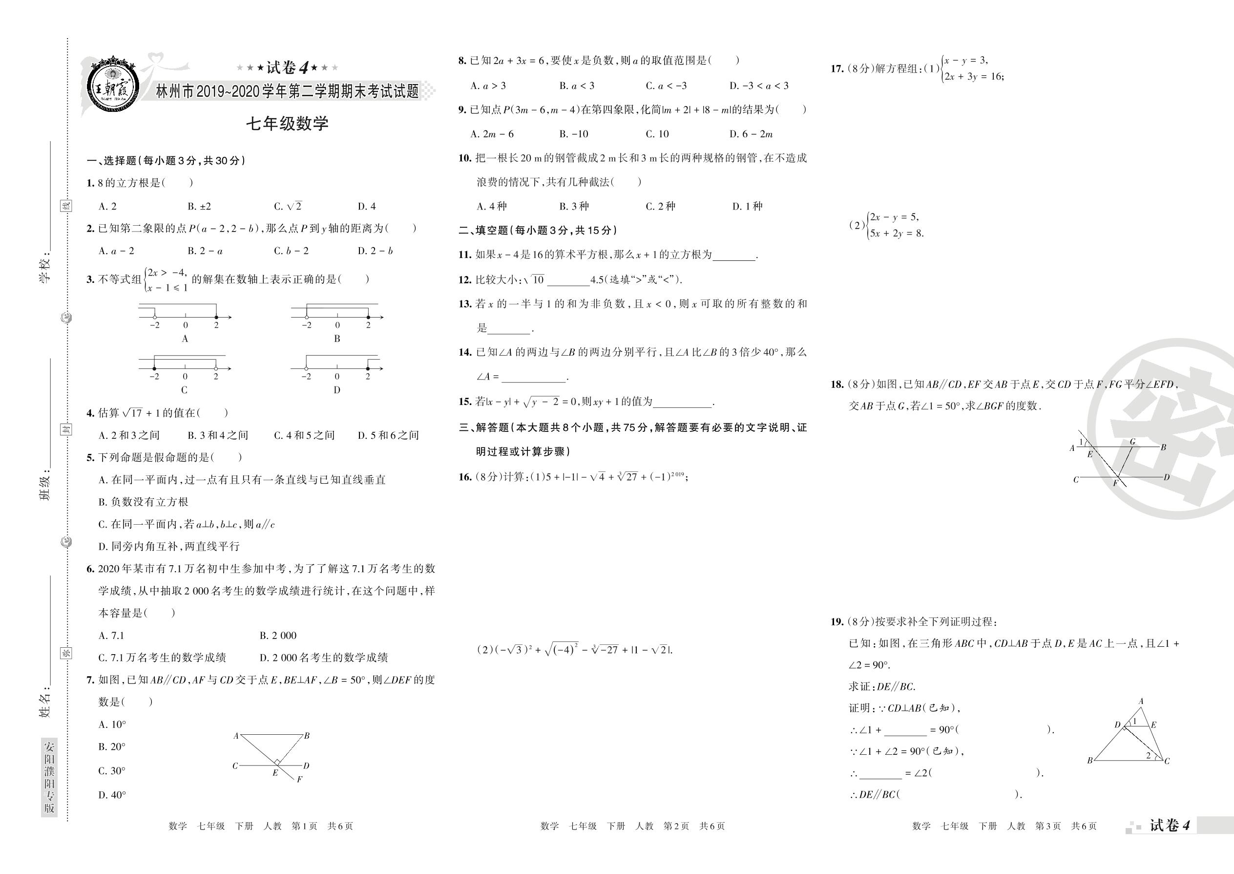 2019-2020学年第二学期林州市七年级数学试卷(人教版)【4】