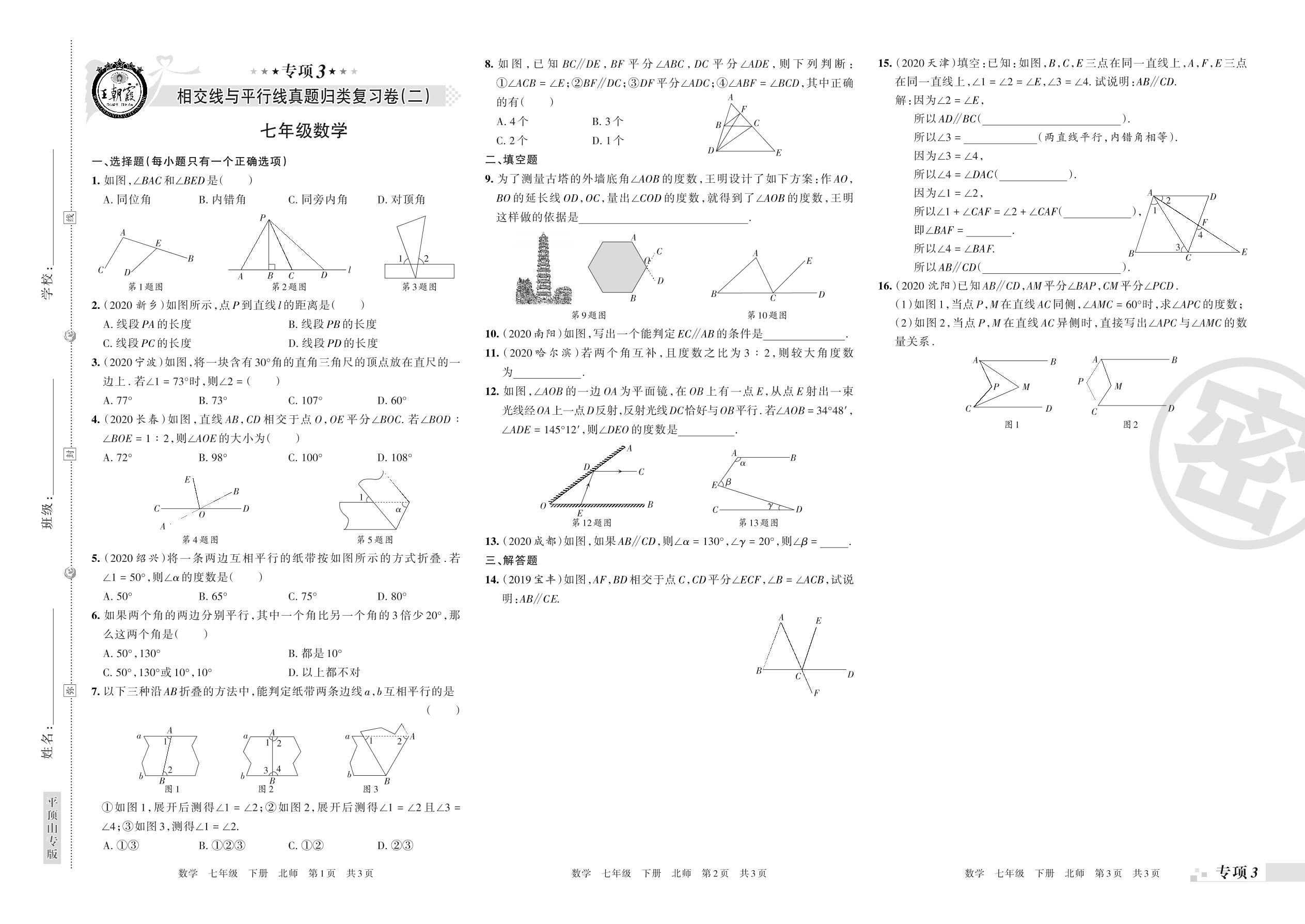 王朝霞期末专项卷——相交线与平行线、变量之间的关系真题归类复习七年级下册数学(北师版)【0】