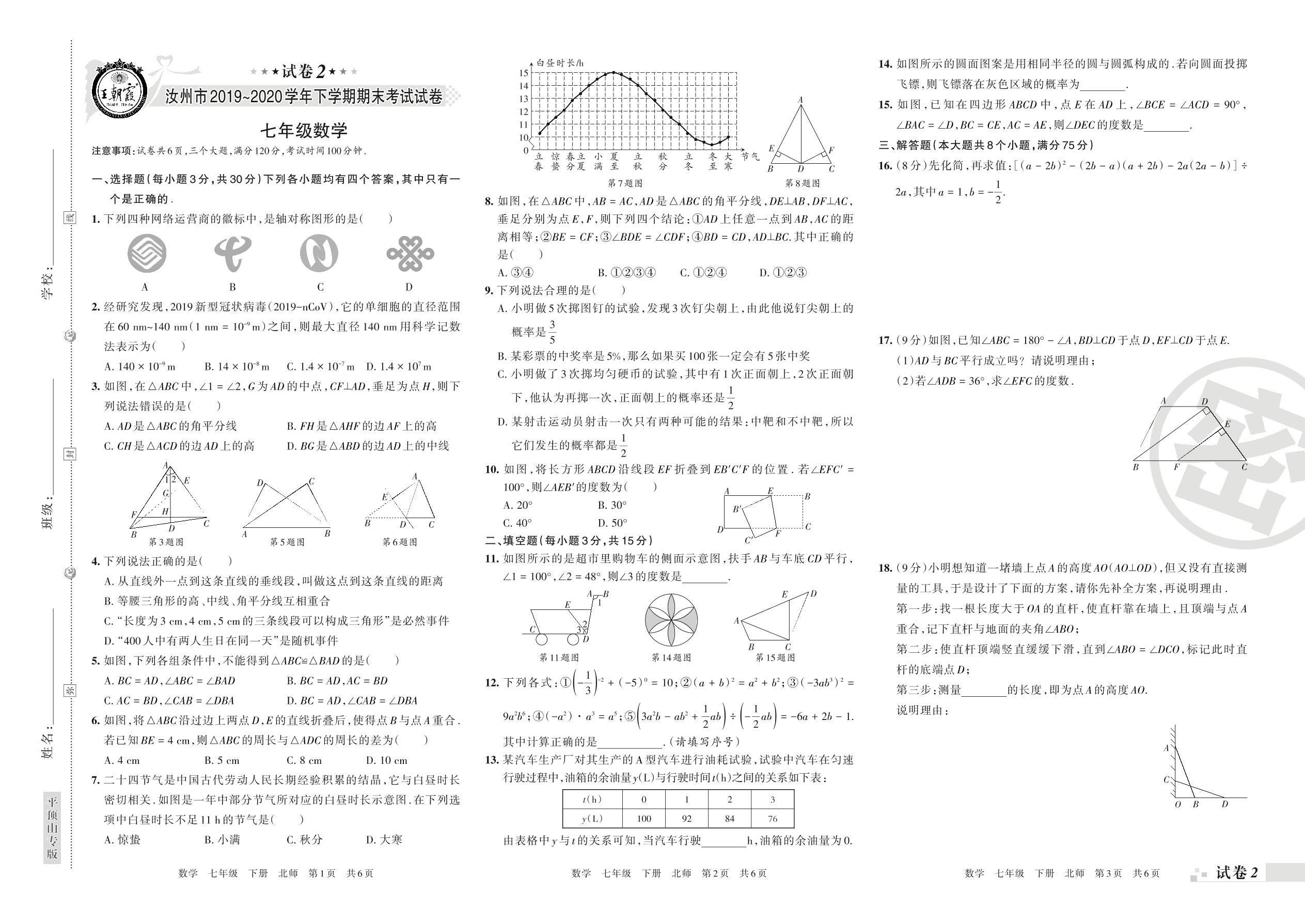 2019-2020学年第二学期汝州市七年级数学试卷(北师版)【2】