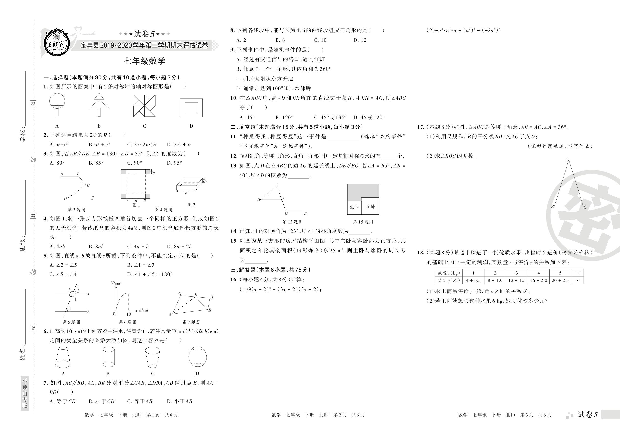 2019-2020学年第二学期平顶山市宝丰县七年级数学试卷(北师版)【5】