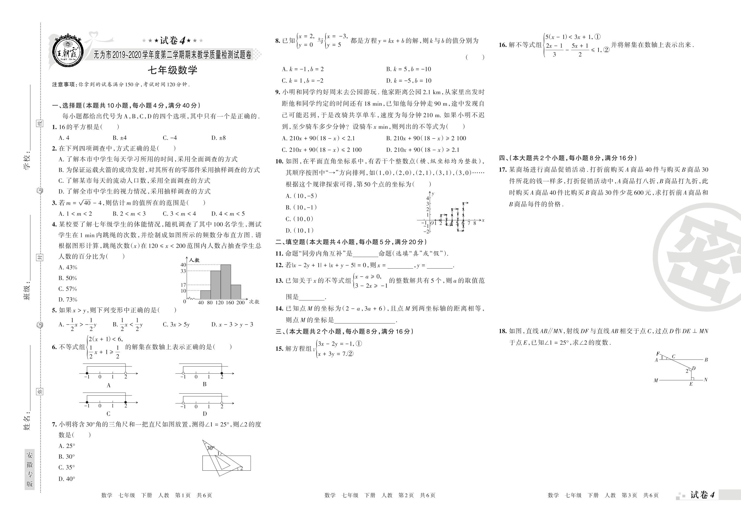 2019-2020学年第二学期无为市七年级数学试卷(人教版)【4】