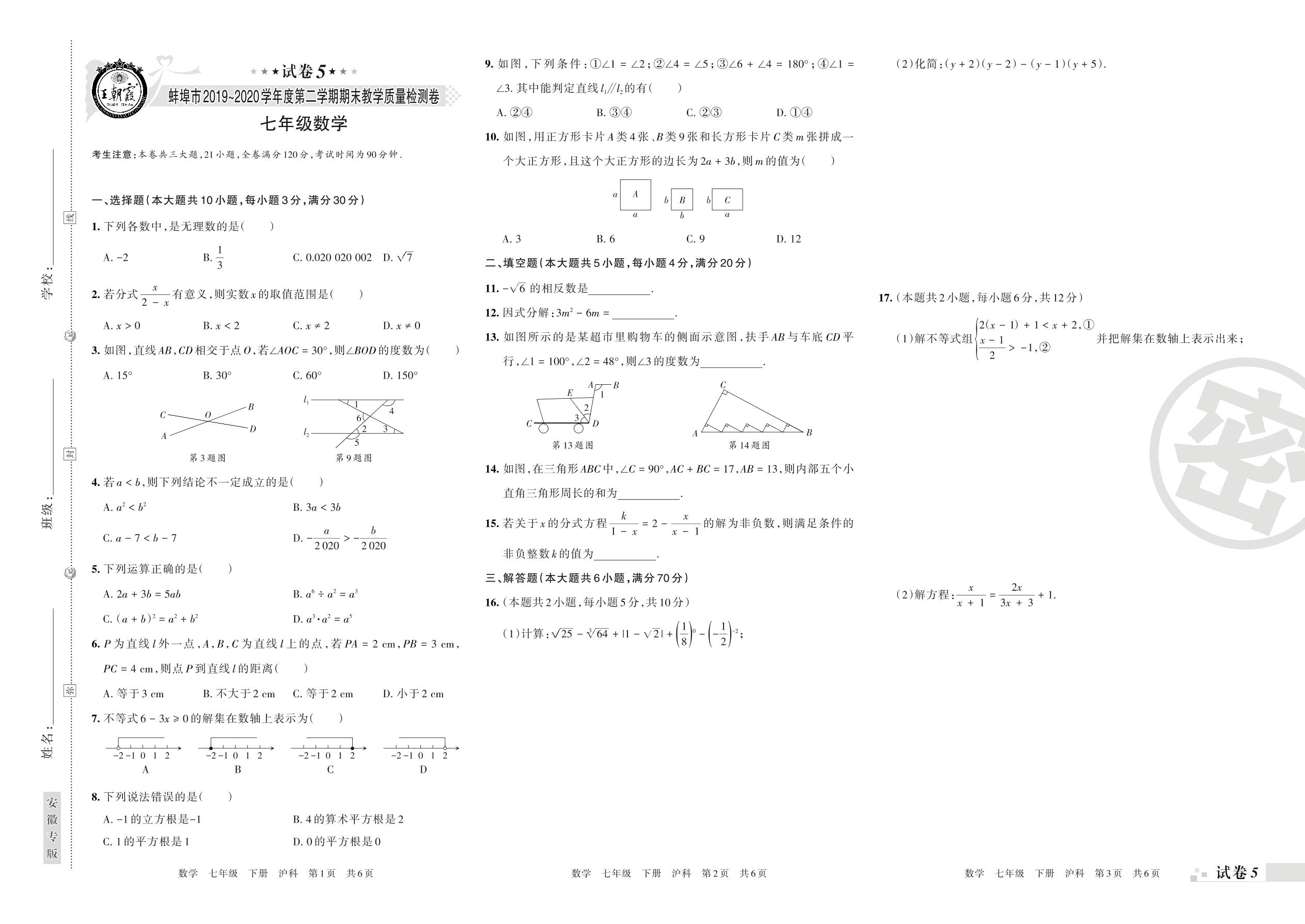 2019-2020学年第二学期蚌埠市七年级数学试卷(沪科版)【5】