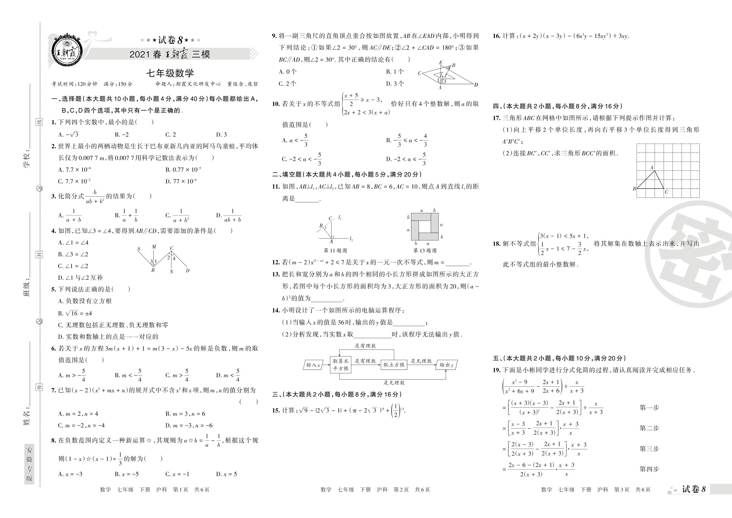 王朝霞期末模拟卷七年级下册数学(沪科版)【8】