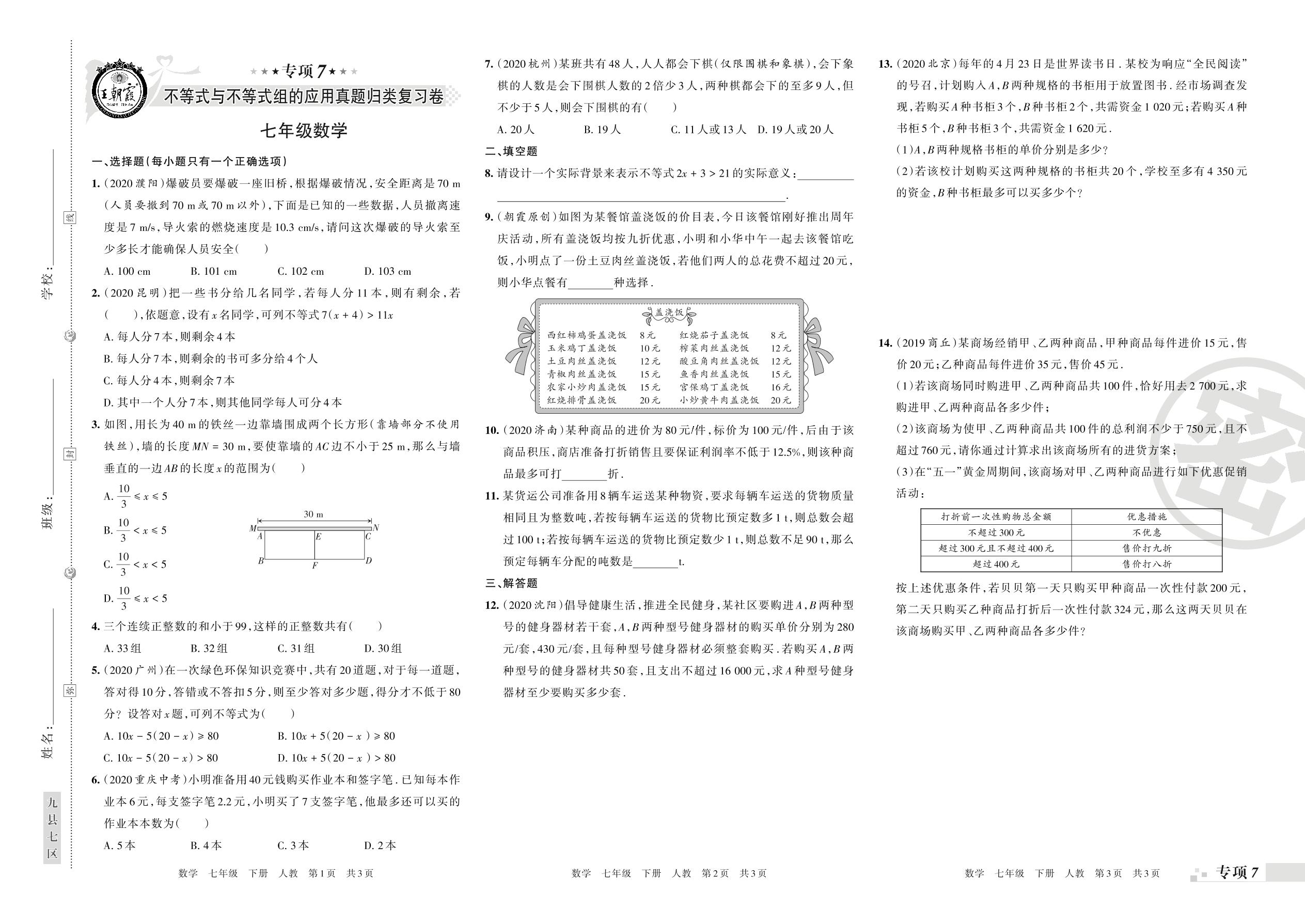 王朝霞期末专项卷——不等式与不等式组的应用、数据的收集、整理与描述真题归类复习七年级下册数学(人教版)【4】