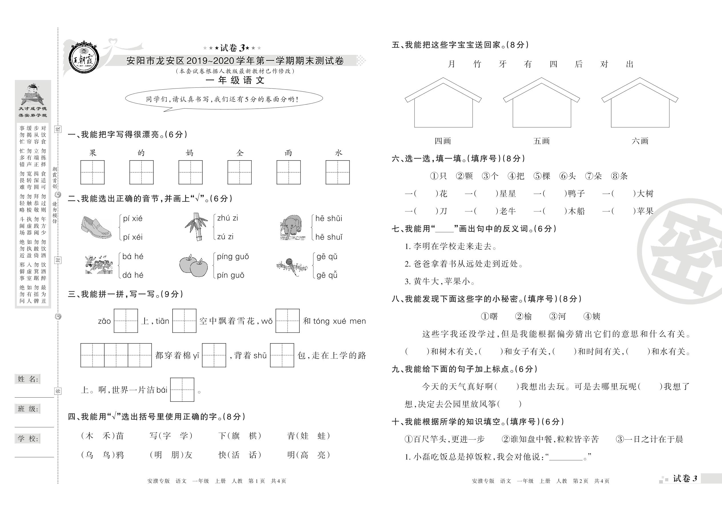 2019-2020学年第一学期安阳市龙安区一年级语文试卷(人教版)【3】