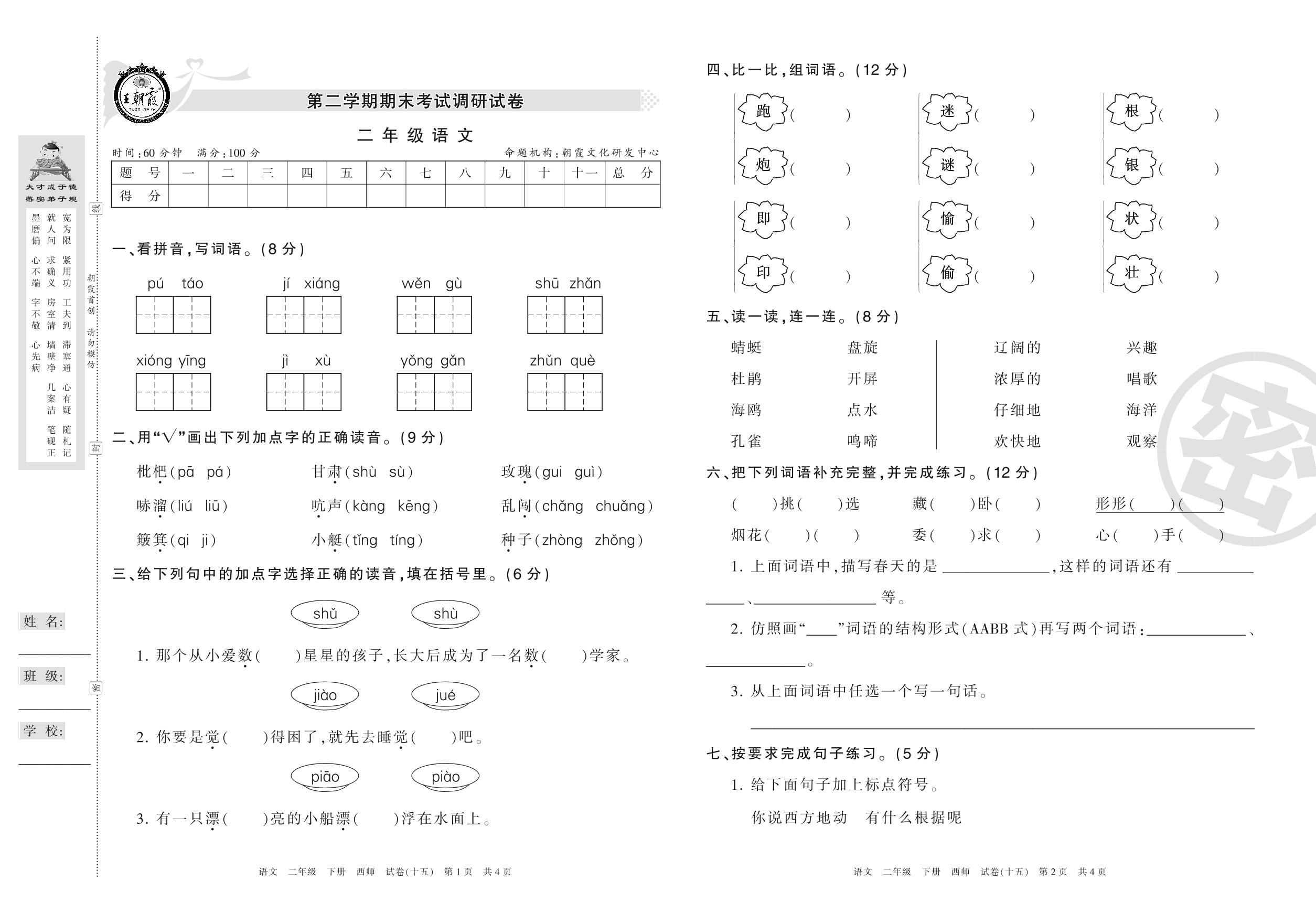 王朝霞期末调研卷二年级下册语文(西师版)【15】