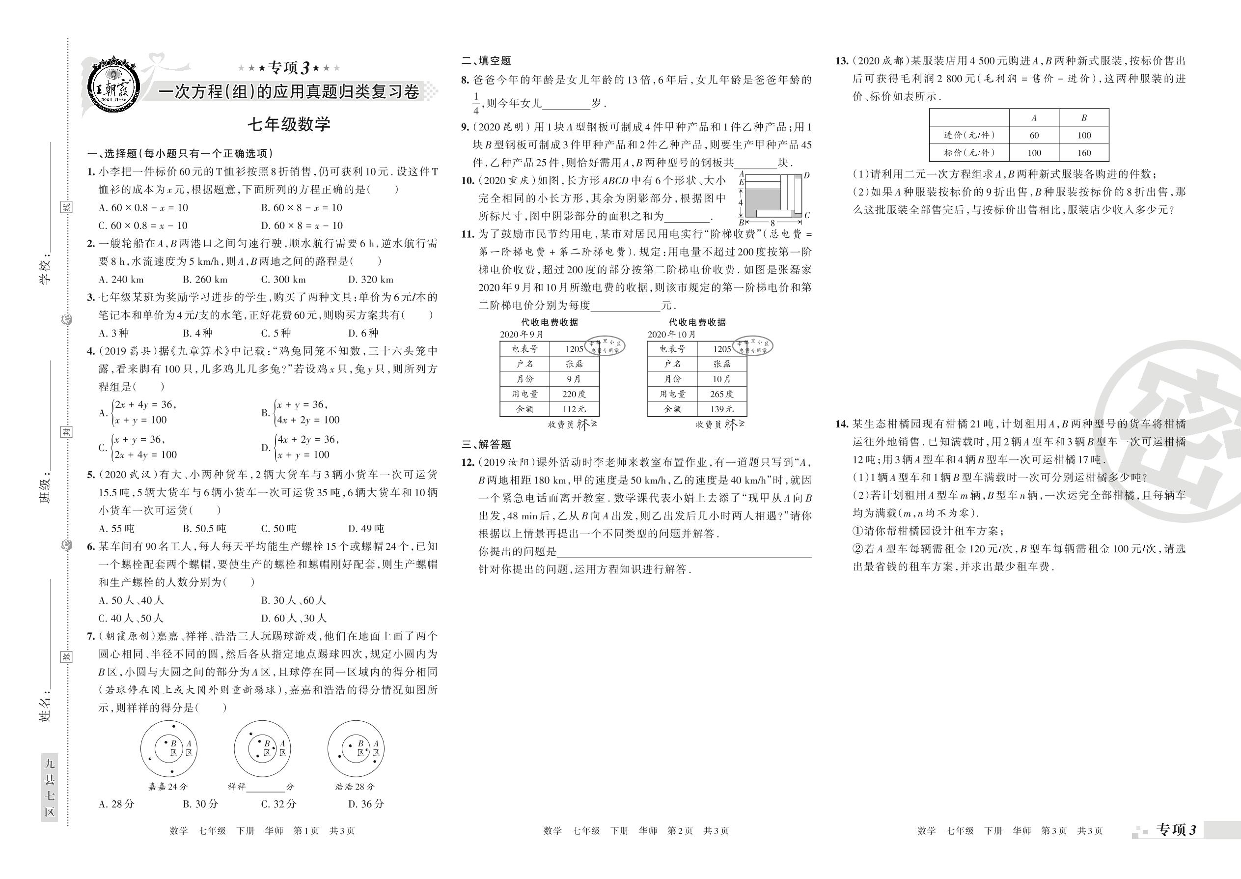 王朝霞期末专项卷——一次方程(组)的应用、一元一次不等式(组)的认识与解法真题归类复习七年级下册数学(华师版)【2】
