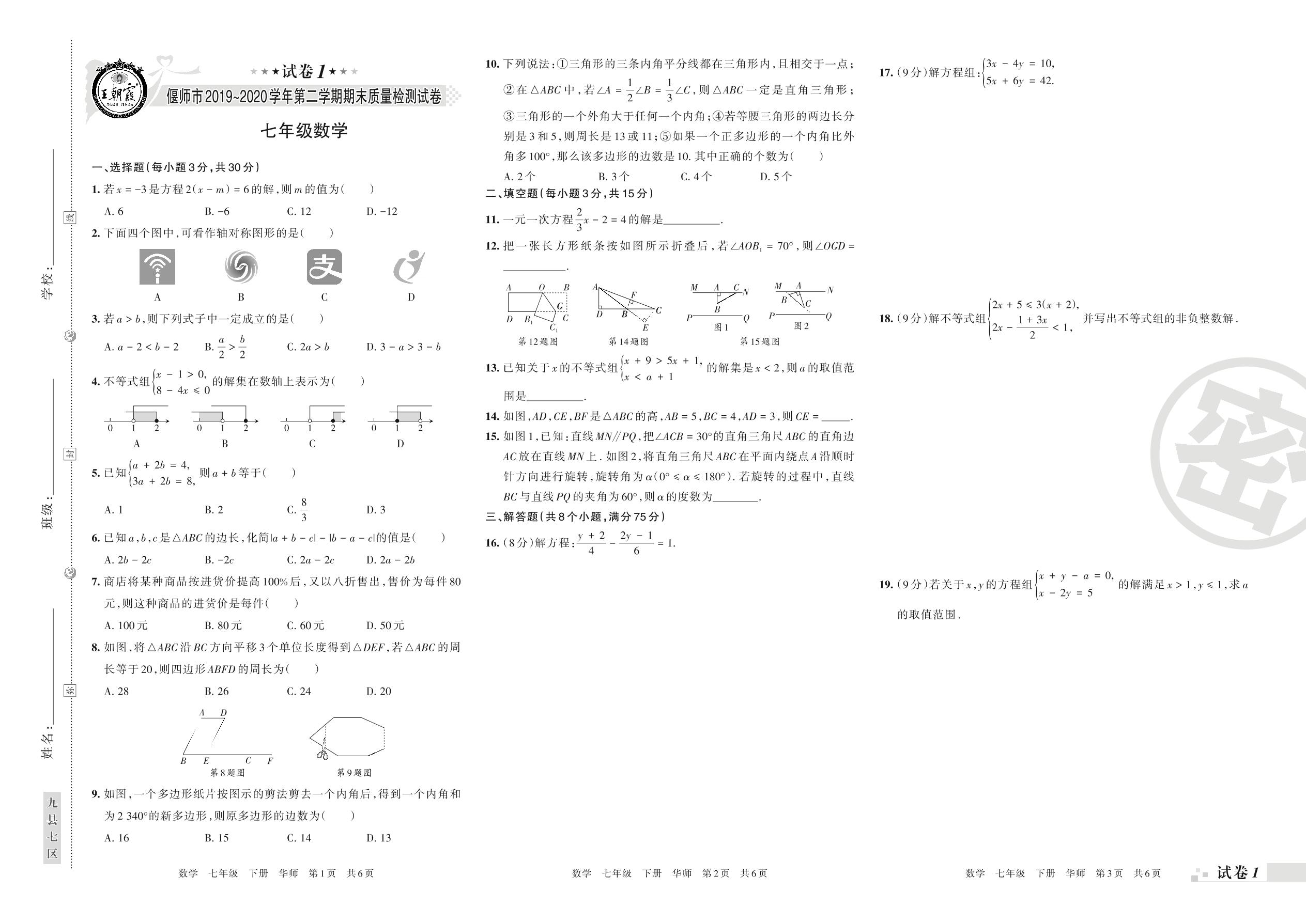 2019-2020学年第二学期偃师市七年级数学试卷(华师版)【1】