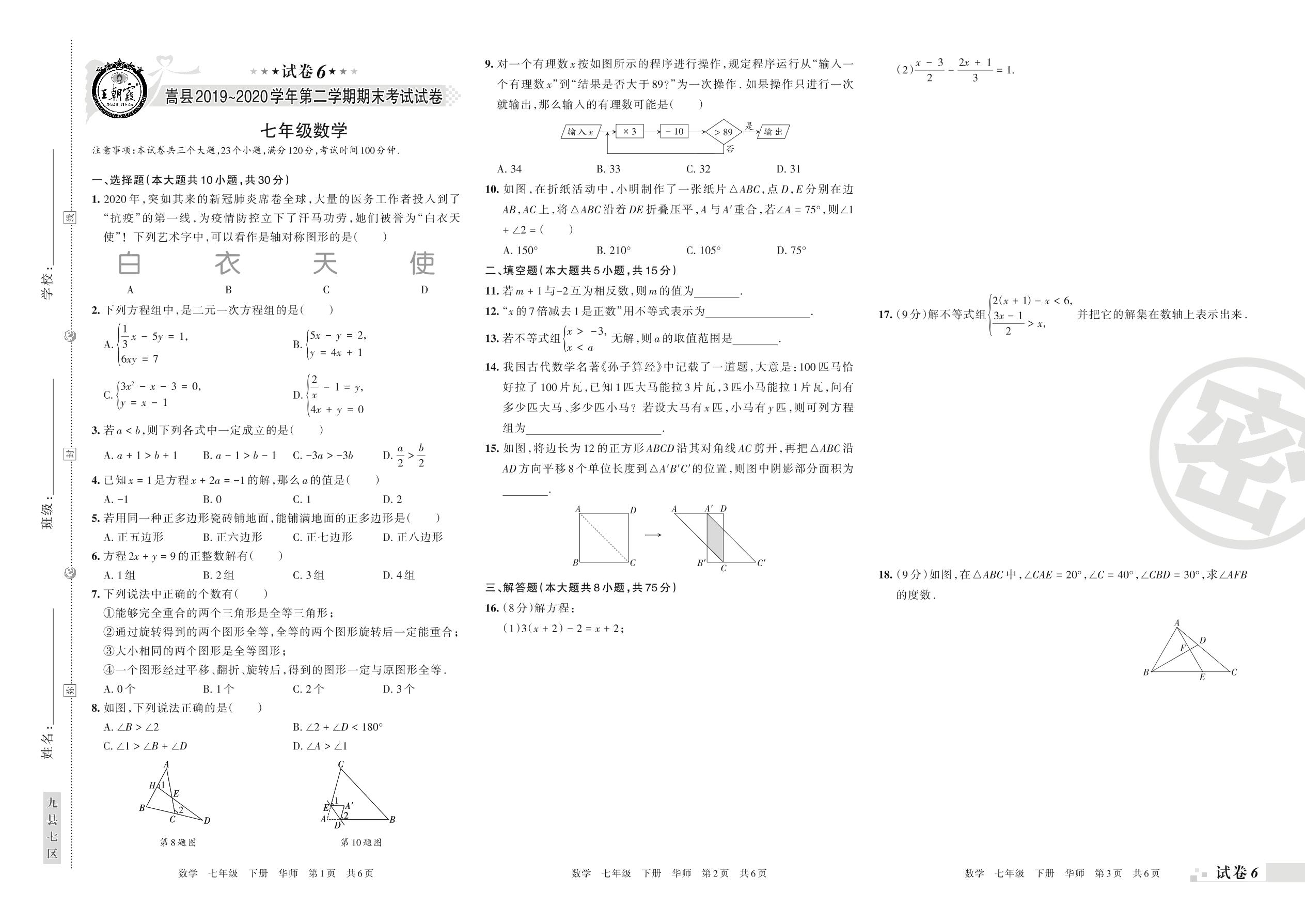 2019-2020学年第二学期洛阳市嵩县七年级数学试卷(华师版)【6】