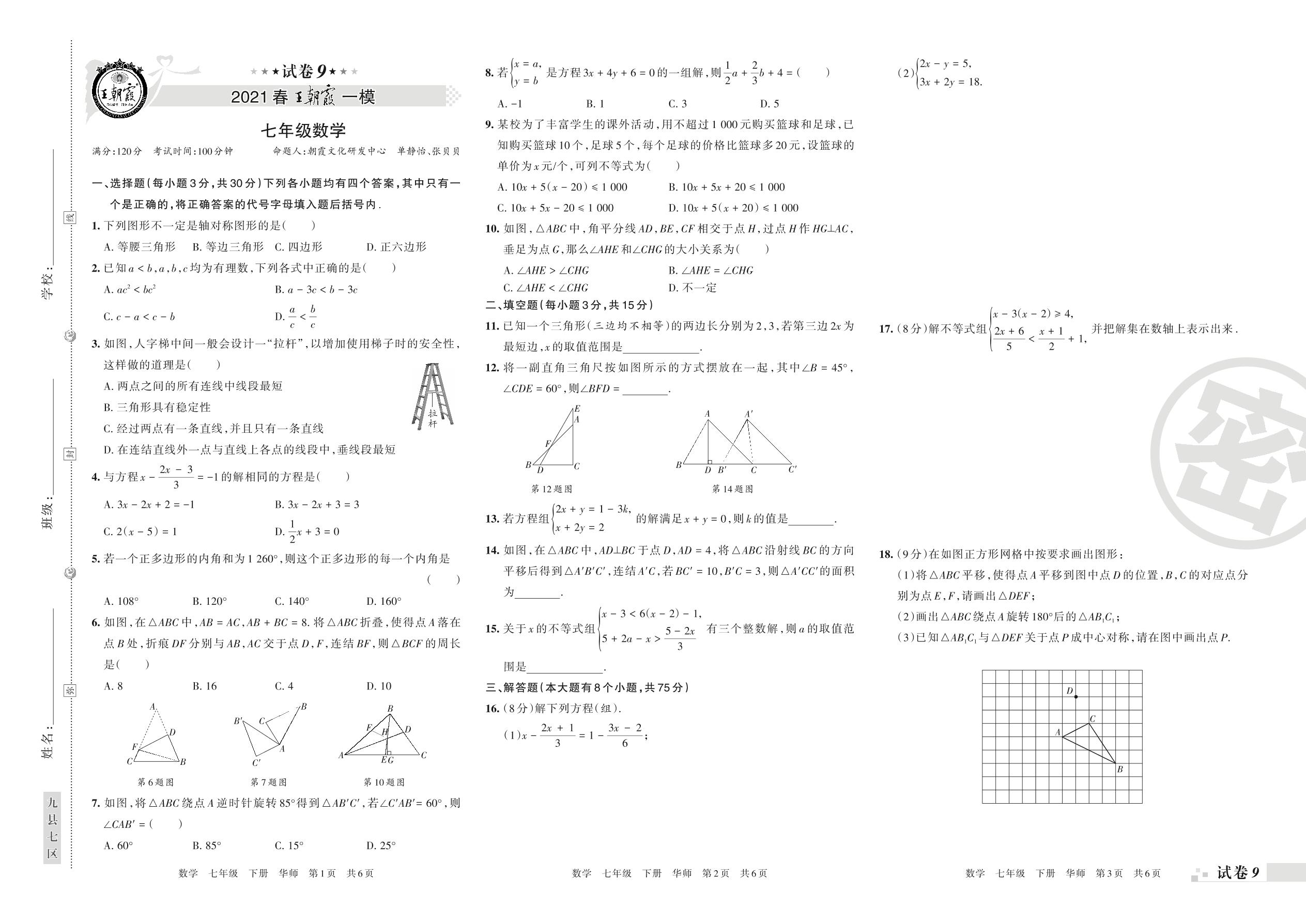 王朝霞期末模拟卷七年级下册数学(华师版)_R210805144611【9】