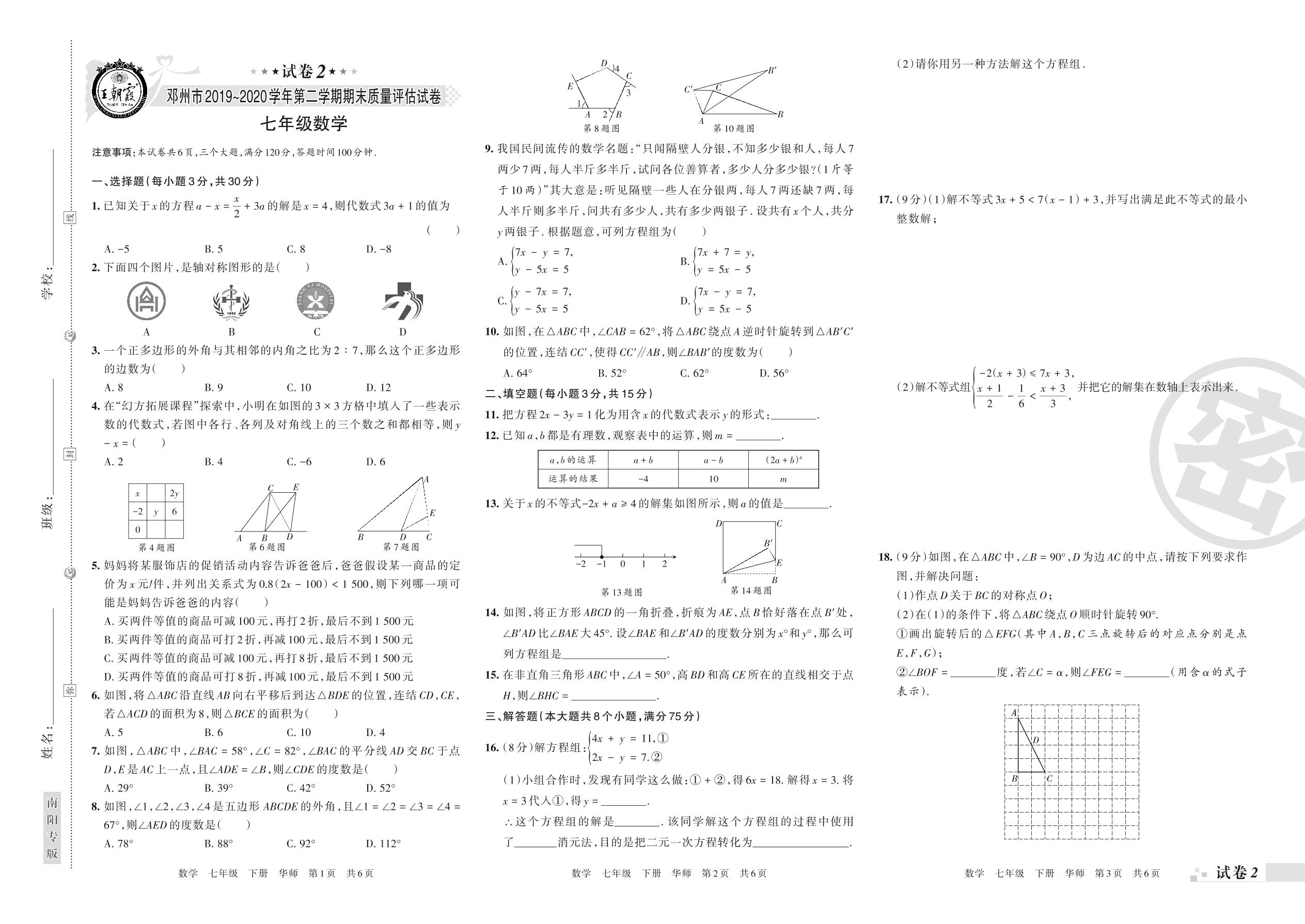 2019-2020学年第二学期邓州市七年级数学试卷(华师版)【2】
