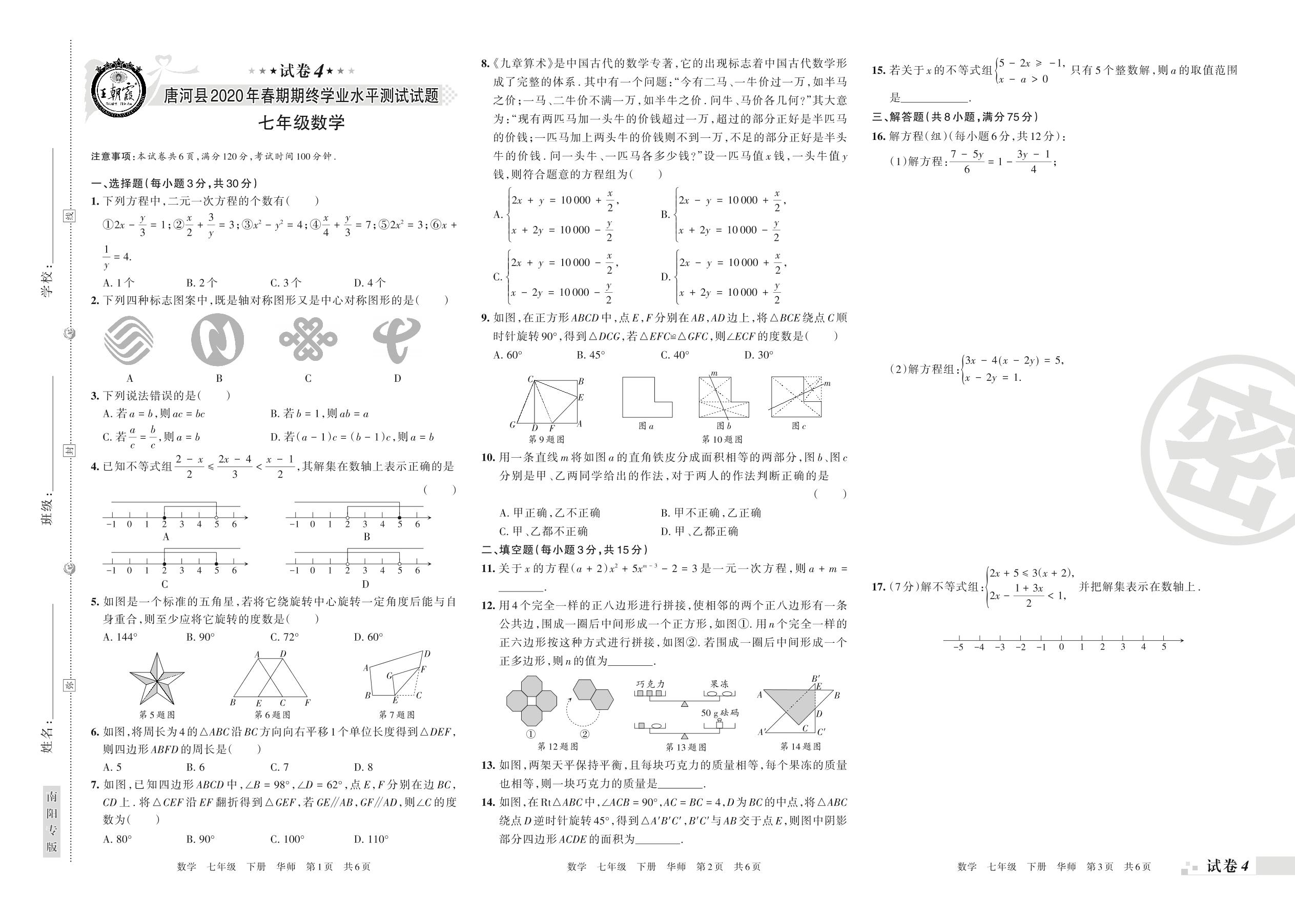 2019-2020学年第二学期南阳市唐河县七年级数学试卷(华师版)【4】