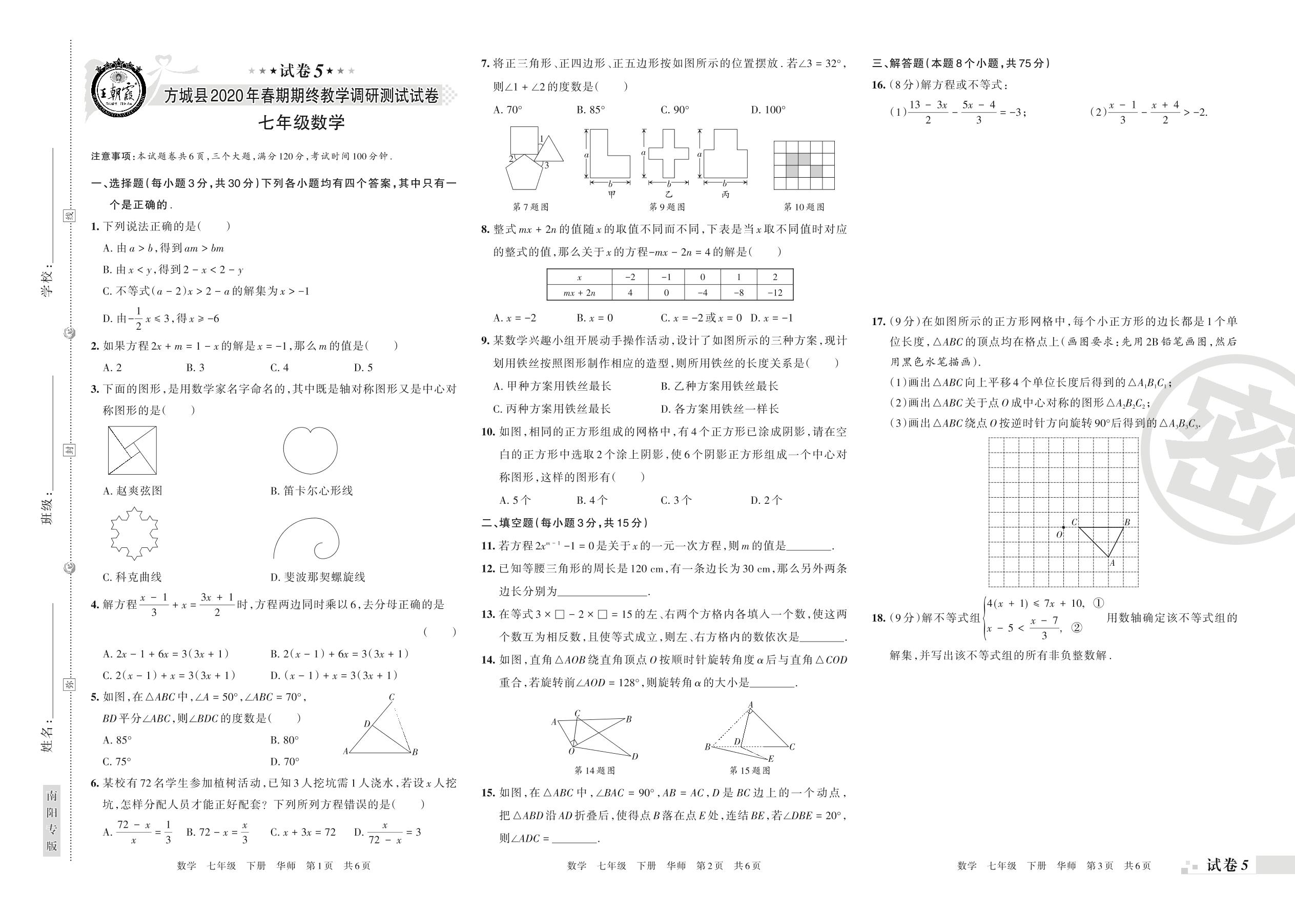 2019-2020学年第二学期南阳市方城县七年级数学试卷(华师版)【5】