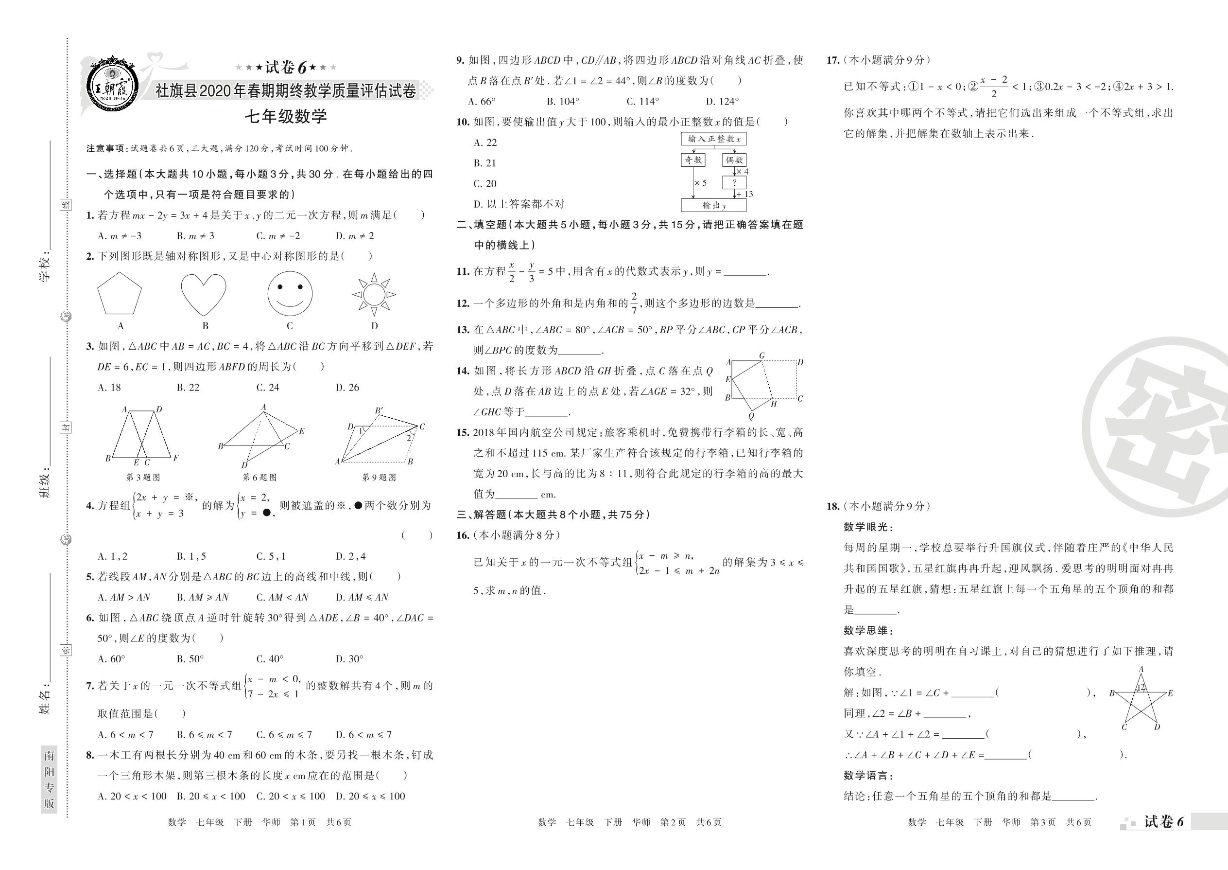 2019-2020学年第二学期南阳市社旗县七年级数学试卷(华师版)【6】