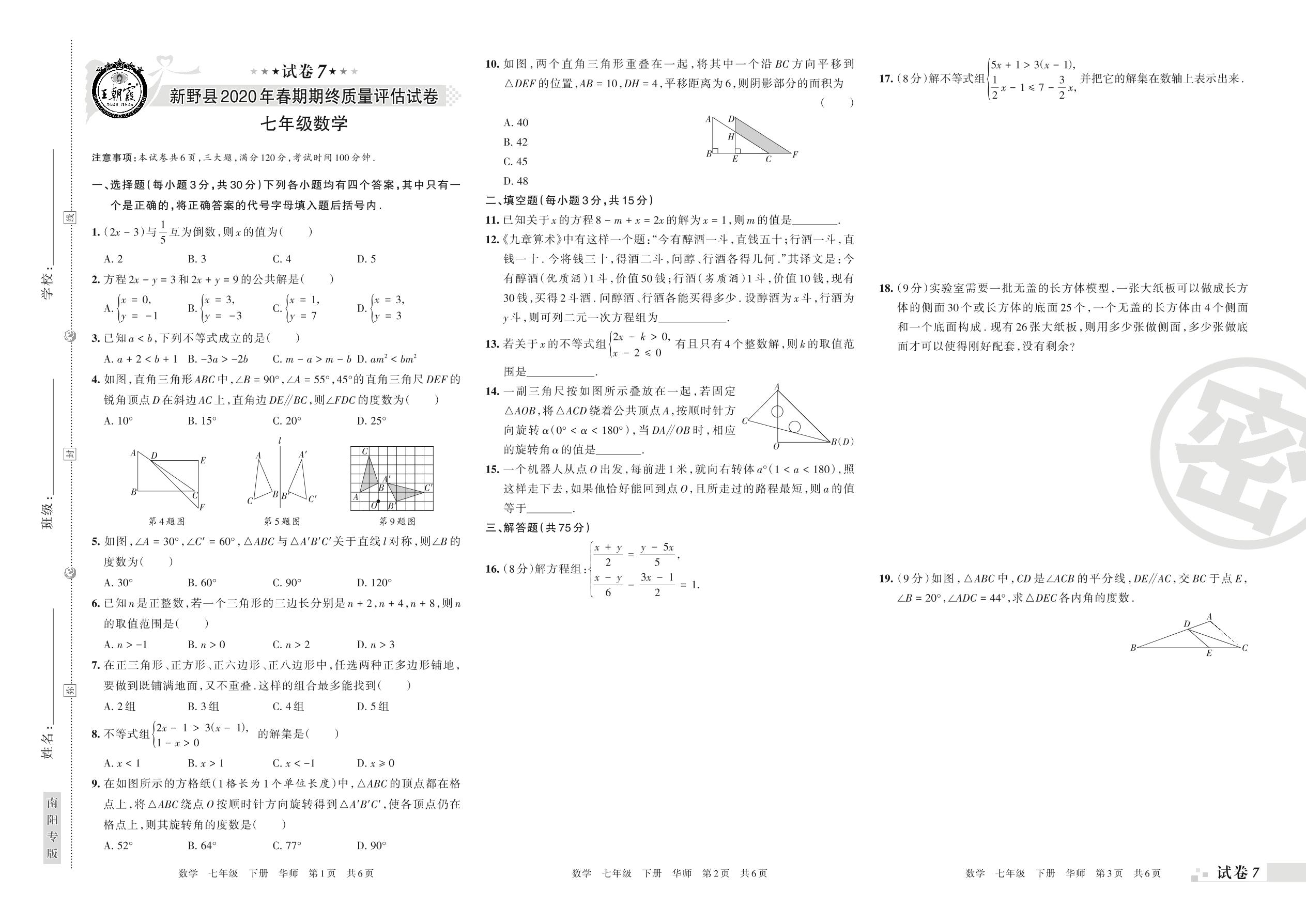 2019-2020学年第二学期南阳市新野县七年级数学试卷(华师版)【7】