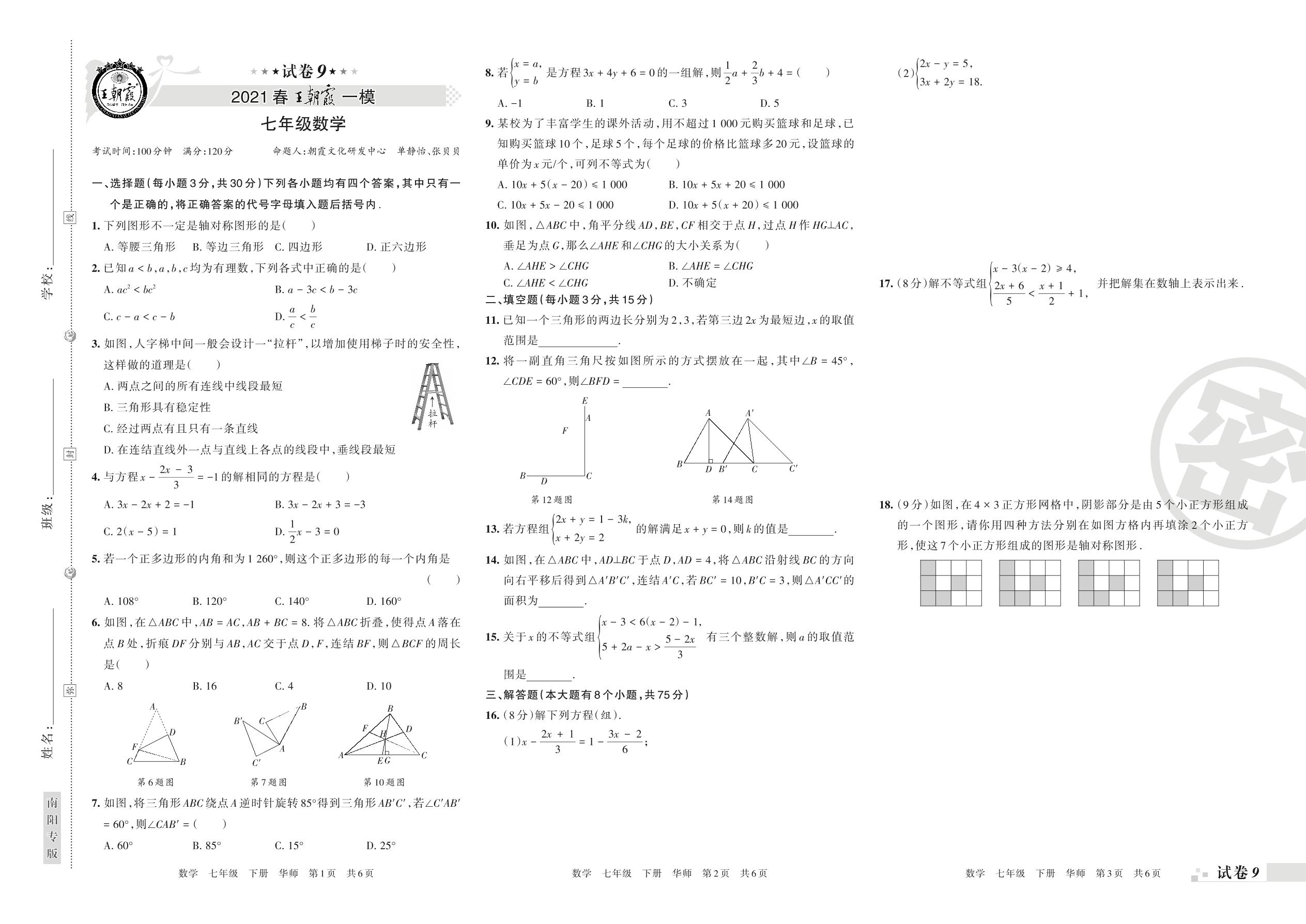王朝霞期末模拟卷七年级下册数学(华师版)_R210805144722【9】