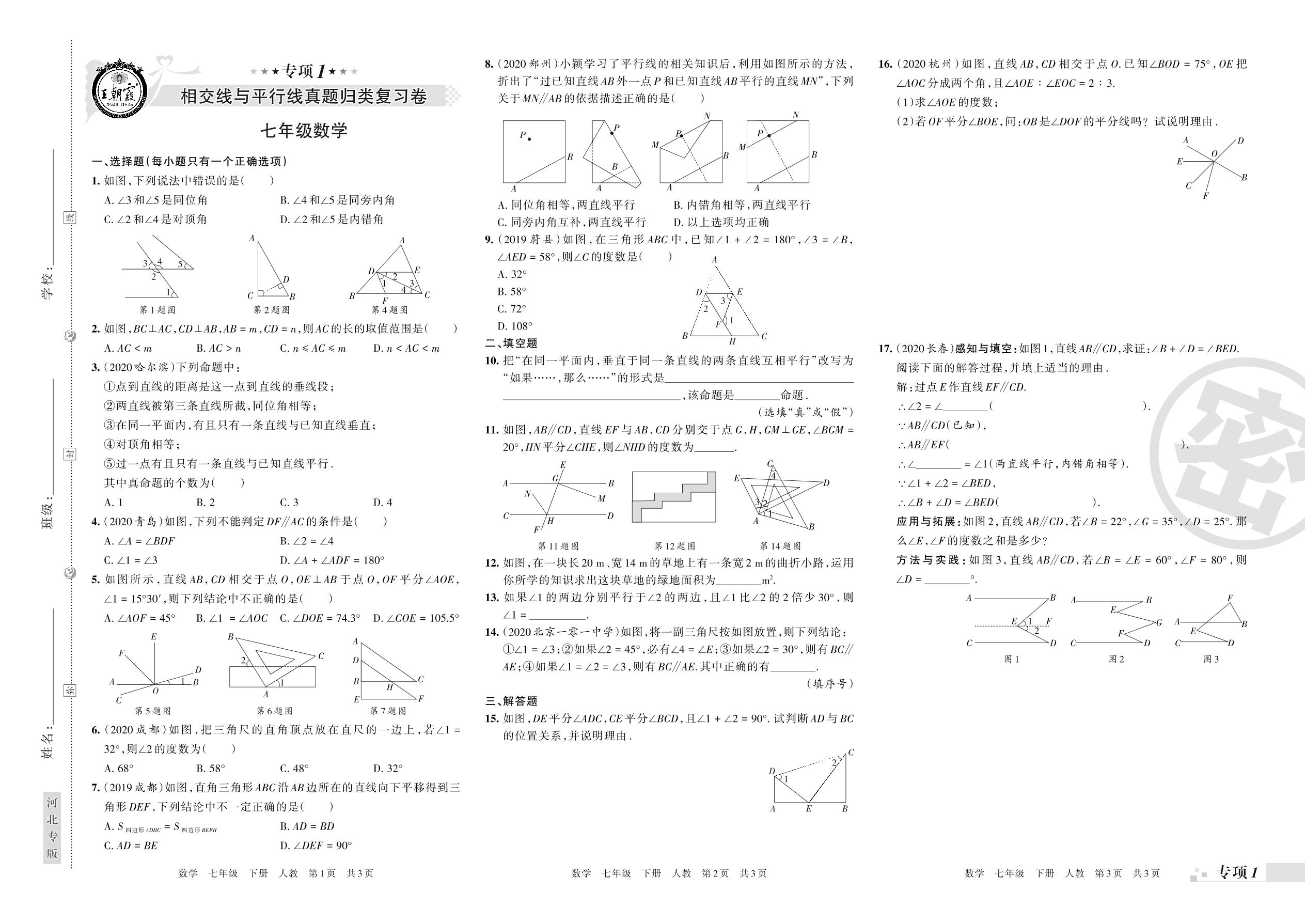 王朝霞期末专项卷——相交线与平行线、实数真题归类复习七年级下册数学(人教版)【0】