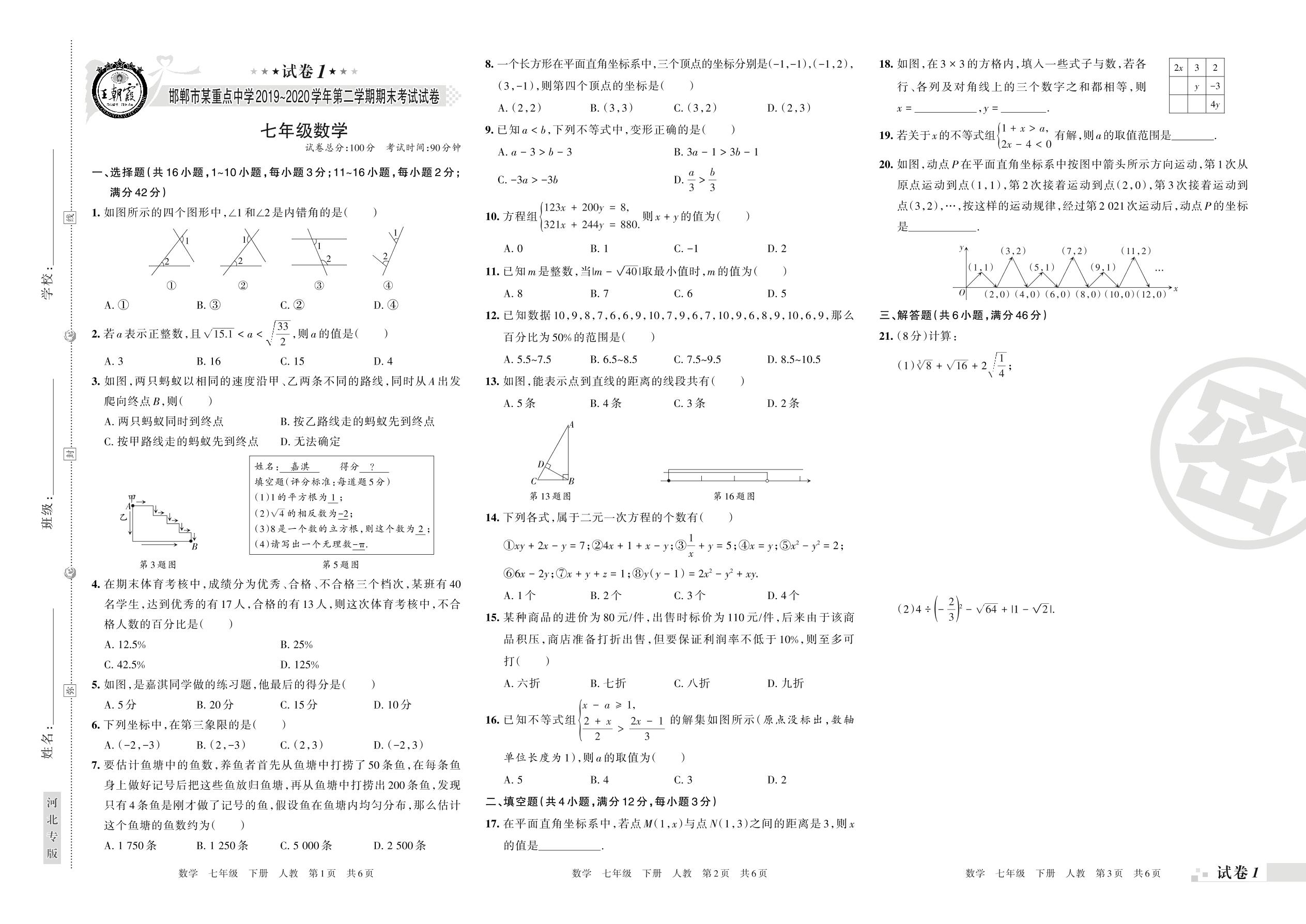 2019-2020学年第二学期邯郸市七年级数学试卷(人教版)【1】
