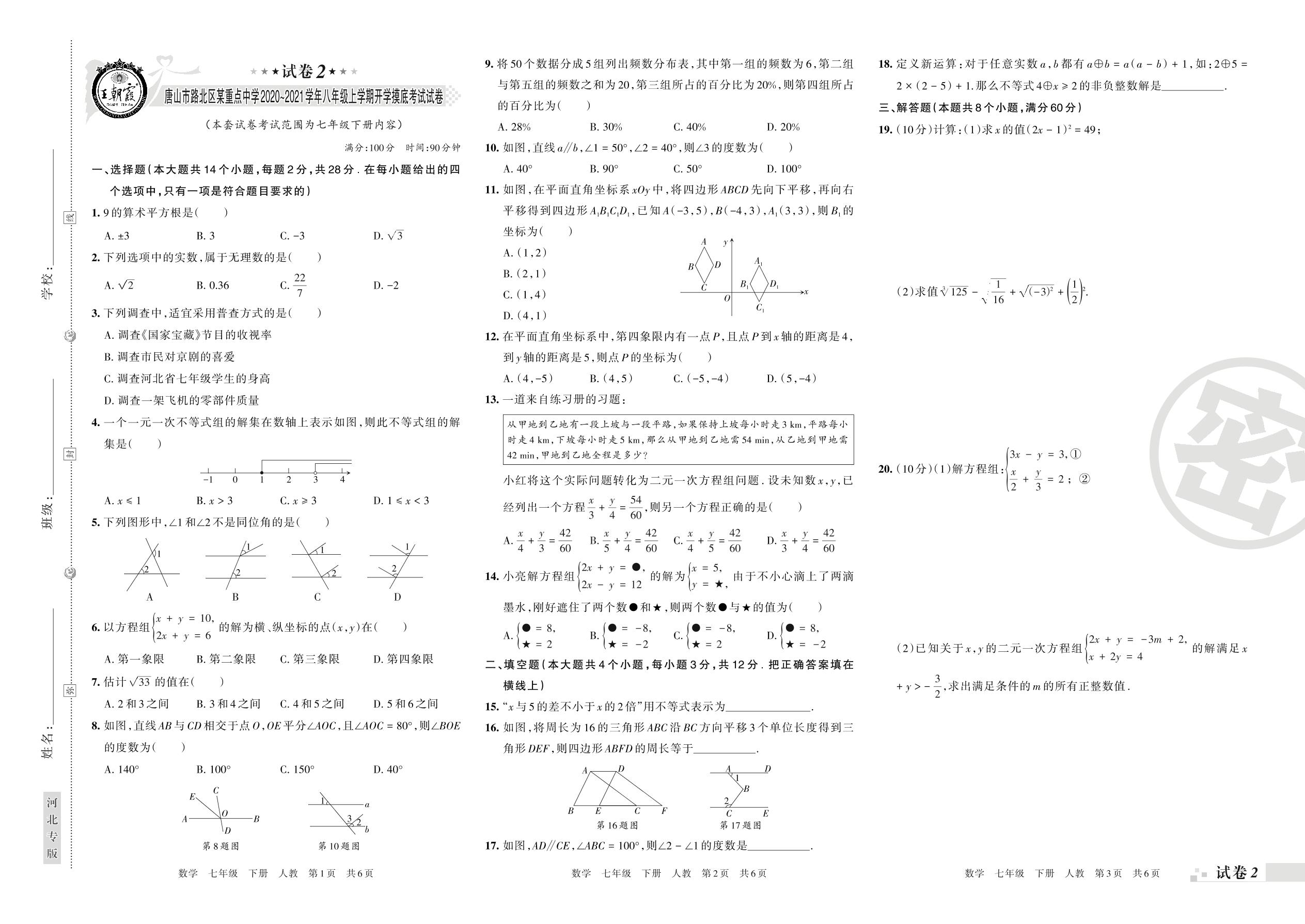 2020-2021学年第二学期唐山市路北区七年级数学试卷(人教版)【2】