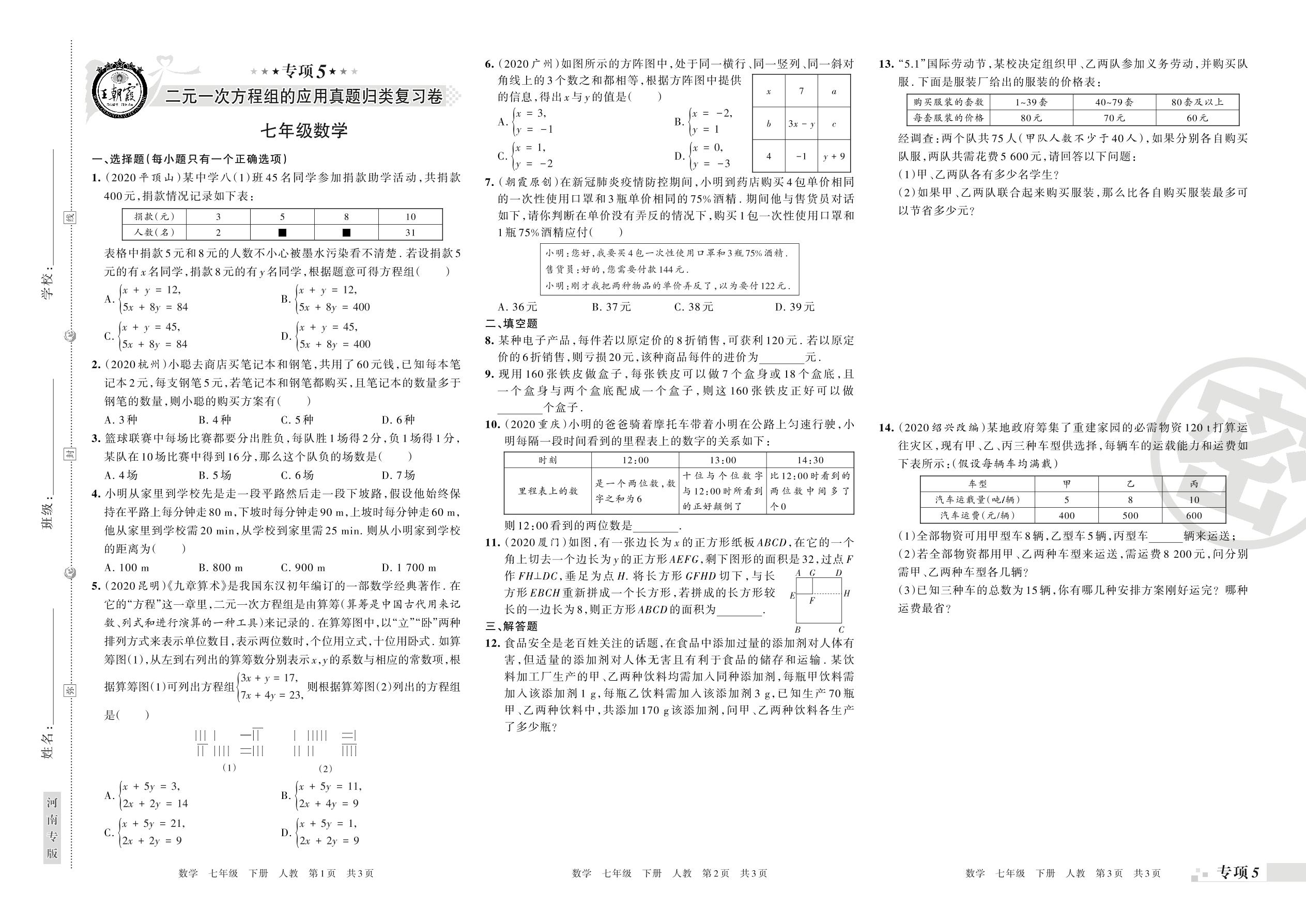 王朝霞期末专项卷——二元一次方程组的应用、不等式与不等式组的认识与解法真题归类复习七年级下册数学(人教版)_R210805144924【0】
