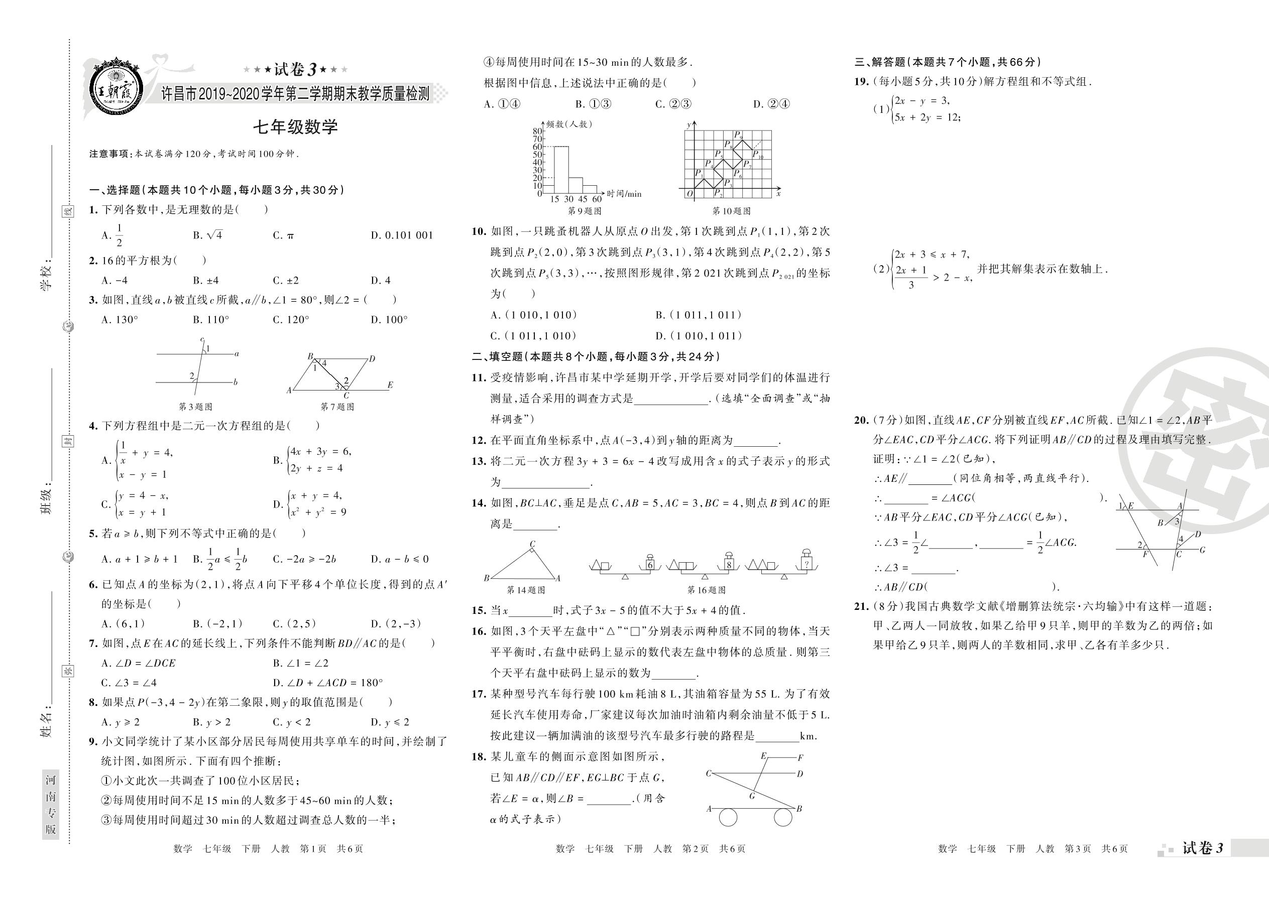 2019-2020学年第二学期许昌市七年级数学试卷(人教版)【3】