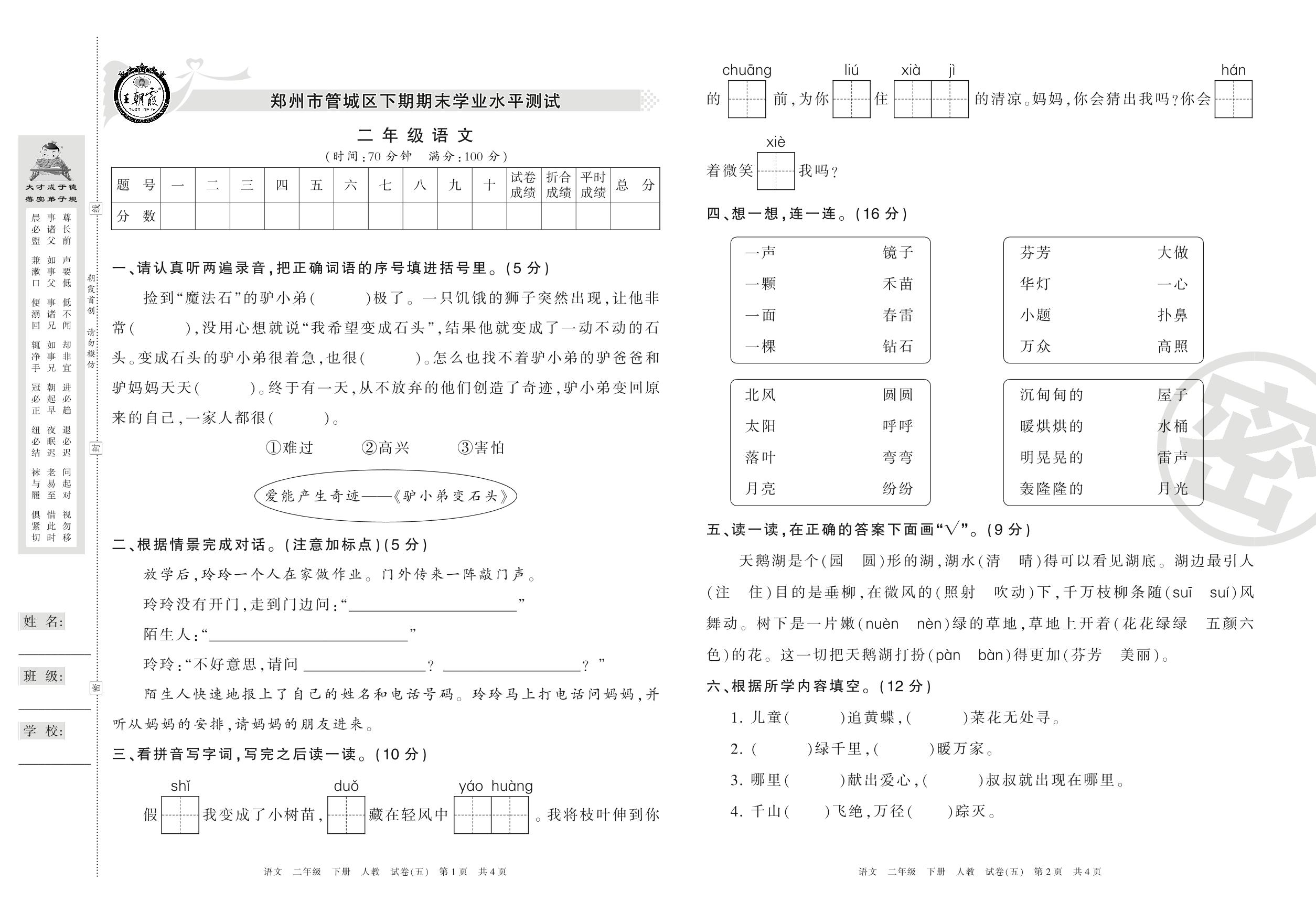 2015-2016学年第二学期郑州市管城区二年级语文试卷(人教版)【5】