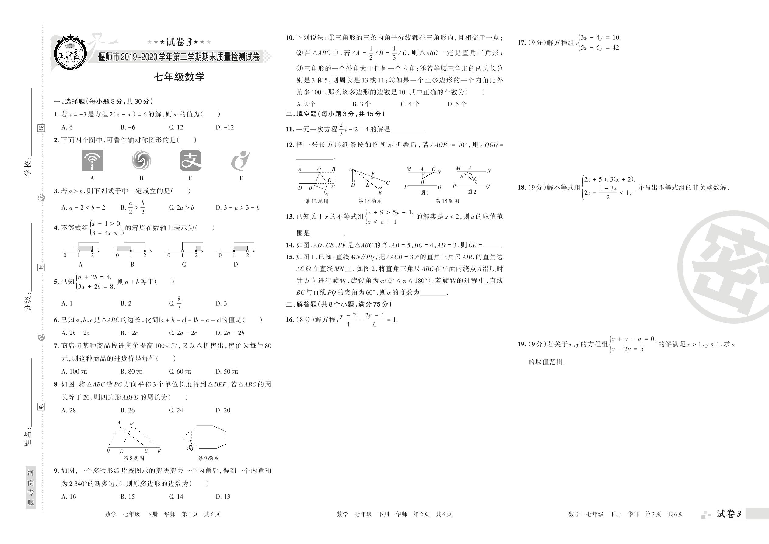 2019-2020学年第二学期偃师市七年级数学试卷(华师版)【3】