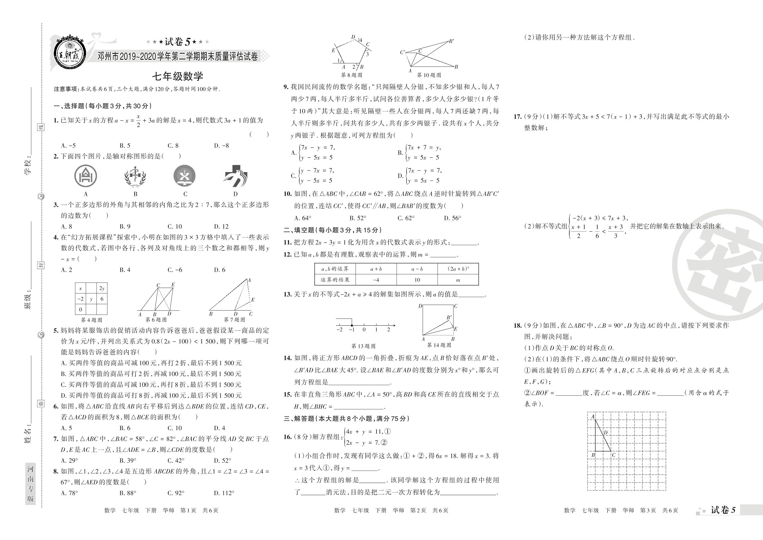 2019-2020学年第二学期邓州市七年级数学试卷(华师版)【5】