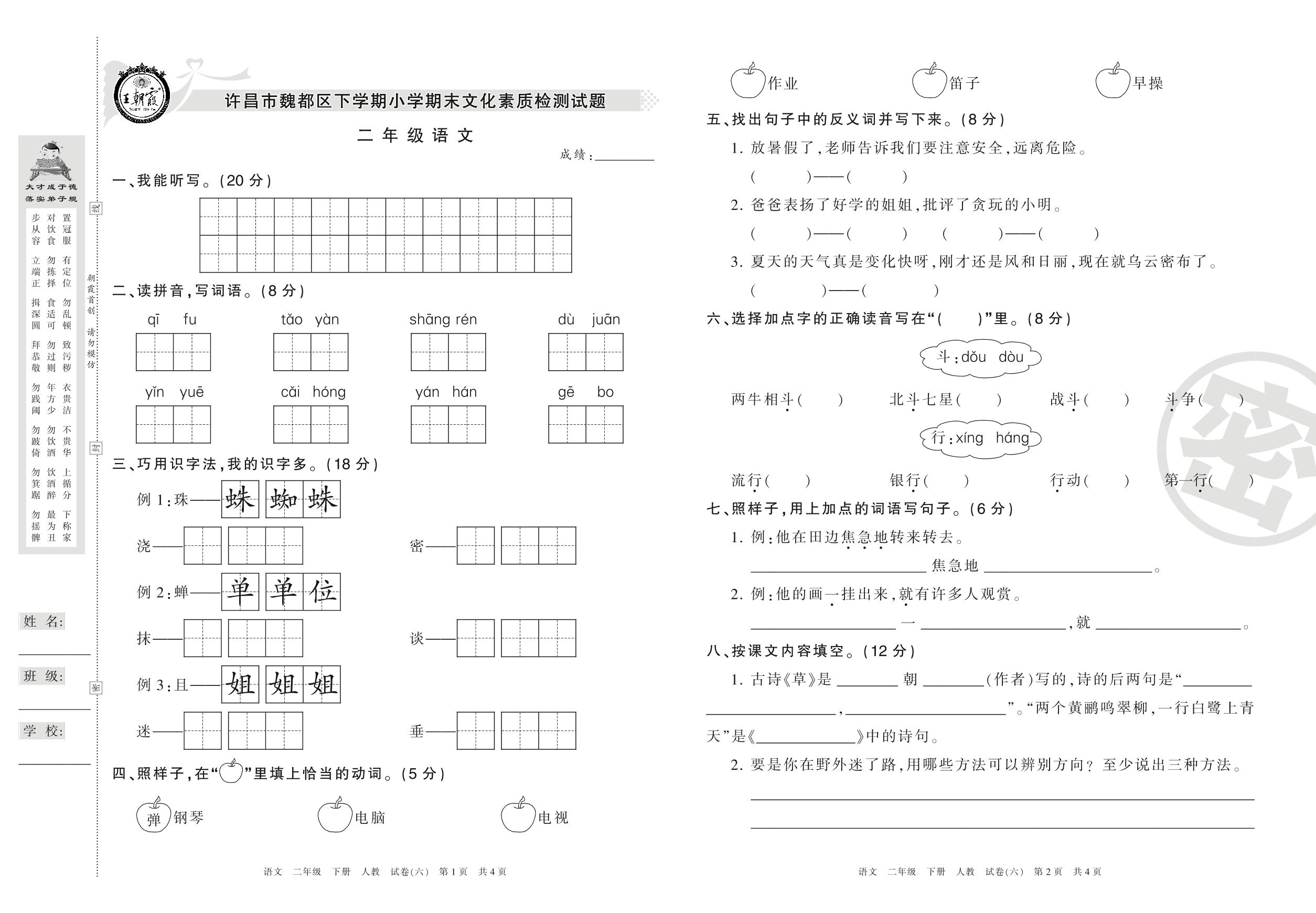 2015-2016学年第二学期许昌市魏都区二年级语文试卷(人教版)【6】