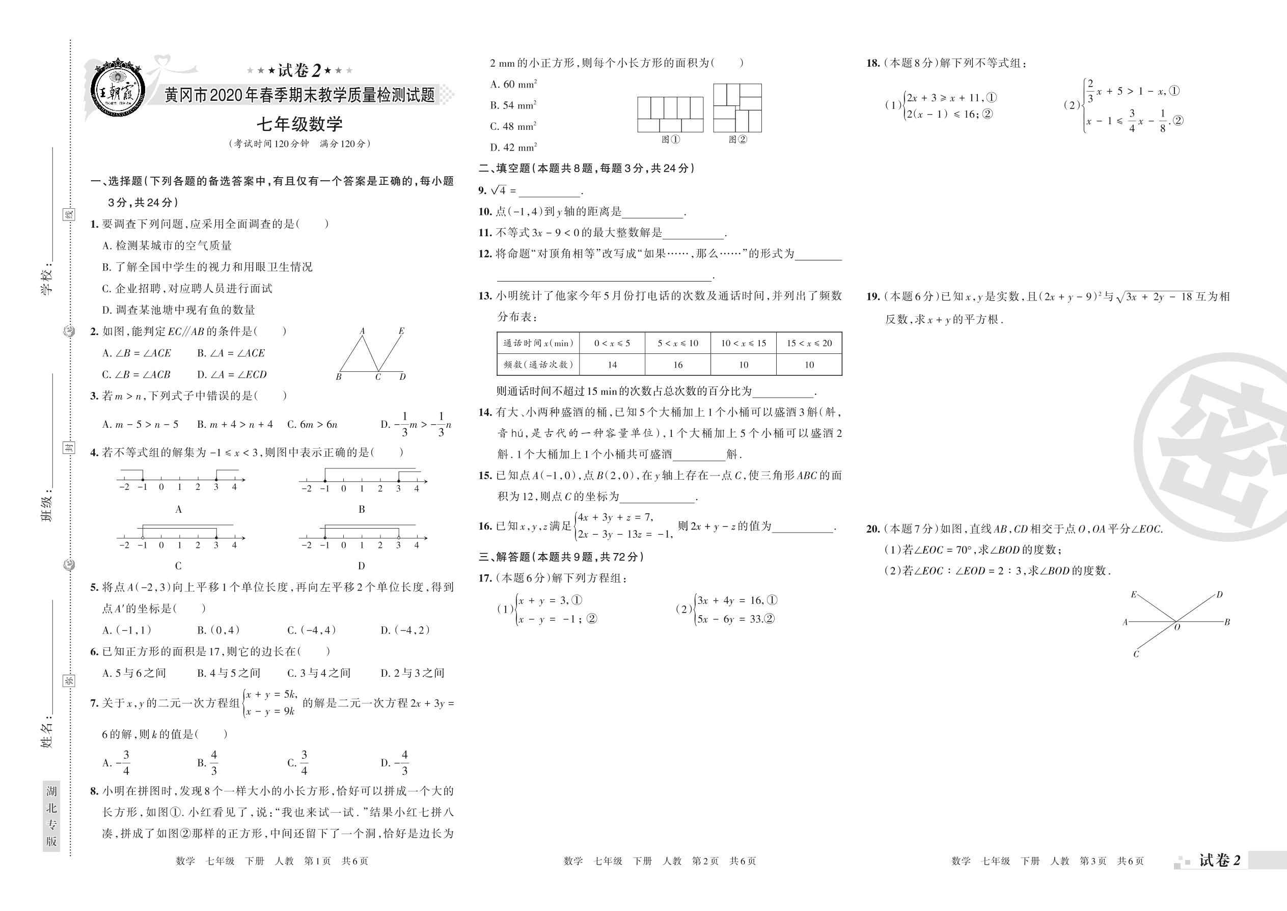 2019-2020学年第二学期黄冈市七年级数学试卷(人教版)【2】